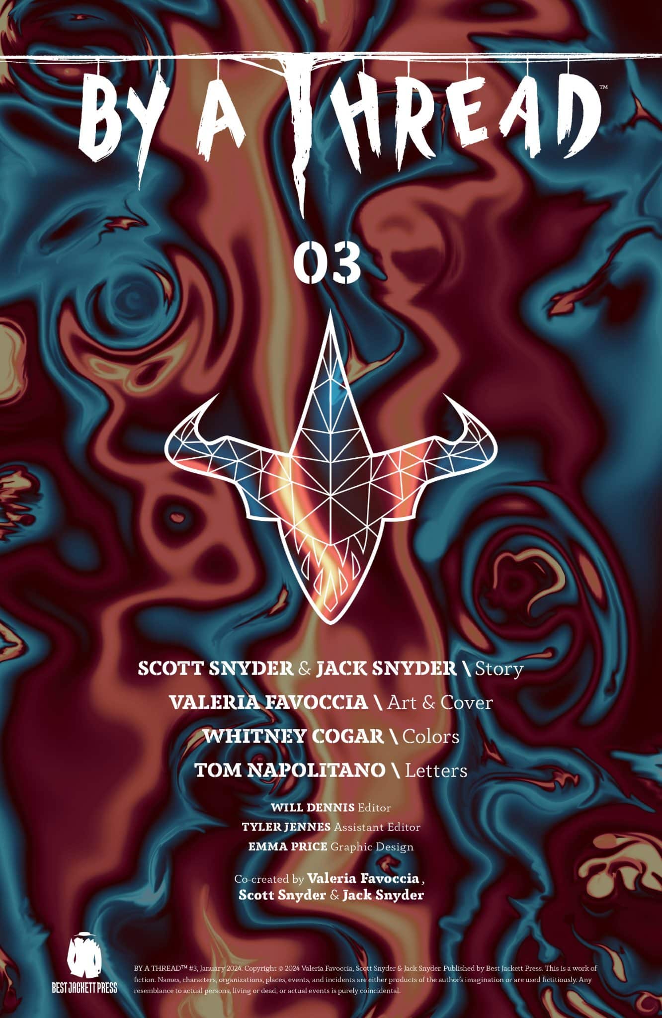 Writer Scott Snyder and his son, Jack Snyder have collaborated on their first-ever comic book series,By A Thread, a post-apocalyptic adventure for the ages. By A Thread features art by Valeria Favocciaand colors by Whitney Cogar, with lettering by Tom Napolitano, and designs by Emma Price.