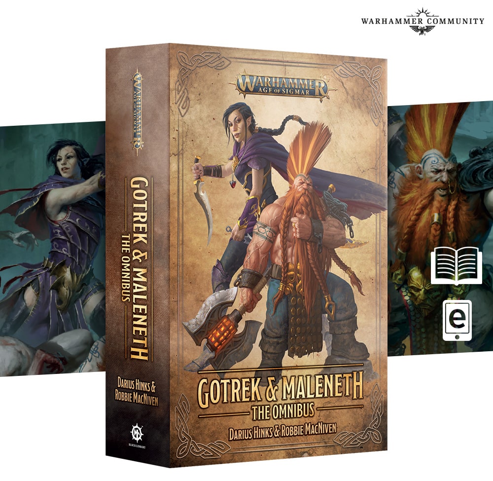 Gotrek and Maleneth: The Omnibus contains Bone Desert by Robbie MacNiven, The Neverspike, Ghoulslayer, Gitslayer, Death on the Road to Svardheim, Soulslayer, and the Crown of Karak-Khazhar by Daris Hinks, plus The Dead Hours by David Guymer. It will be available in paperback and eBook formats.