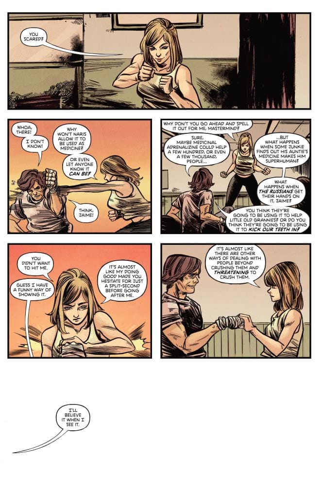 Josie and the Pussycats is a gorgeous, funny book that ended much too soon although it is nice to see artist Audrey Mok working on the main Archie title. Writers Cameron DeOrdio and Marguerite Bennett craft the rare Archie book that looks at both romantic and platonic relationships from the POV of young adults, not teenagers. They, artist Mok, and colorist Kelly Fitzpatrick imbue the title with a Saturday Morning cartoon zaniness, including high speed boat and motorcycle chases, kidnappings, and jokes about the polar bears from The Golden Compass. Yes, DeOrdio and Bennett overload all kinds of pop culture references and allusions in Josie, but it adds to the book’s energetic feel along with Mok’s fantastic fashion designs and Fitzpatrick’s bold colors. Josie and the Pussycats has some real heart to it with characters having all kinds of intense conversations about love, friendship, and fame between the over-the-top setpieces.