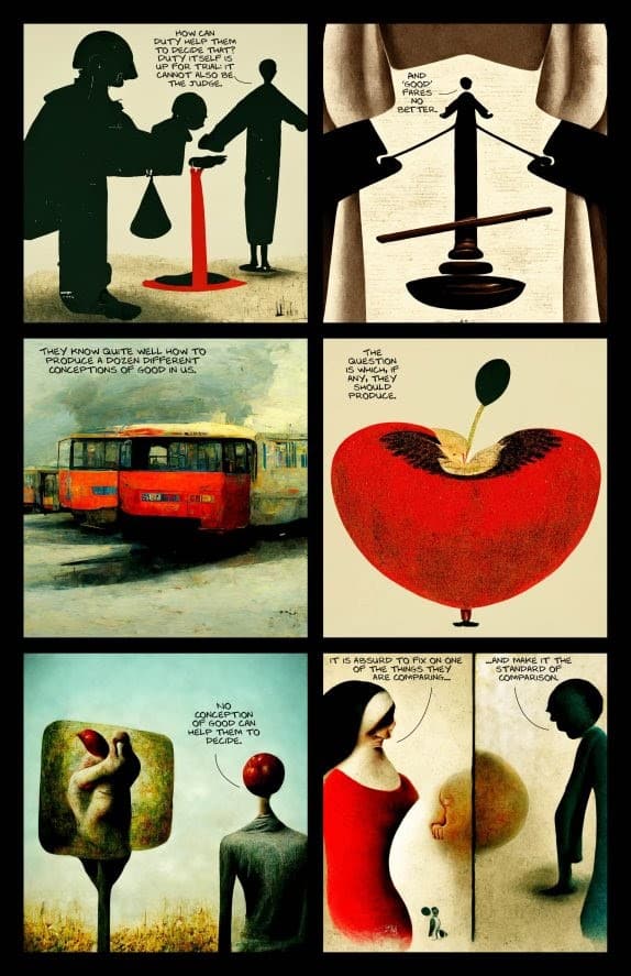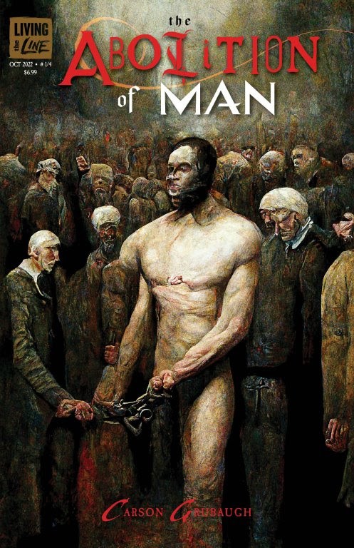 Award-winning oil painter turned Eisner-nominated cartoonist Carson Grubaugh has created a four-issue comic book series, The Abolition of Man, in collaboration with an AI image-generation system, MidJourney AI. For the duration of the miniseries, Grubaugh, an accomplished illustrator and painter, has handed over all illustration duties solely to an AI image generator, which operates by responding to text prompts from the user. For this first issue, Grubaugh supplied the AI with lines from C.S. Lewis’ groundbreaking lecture, “The Abolition of Man”, and used the images generated by the AI unit.