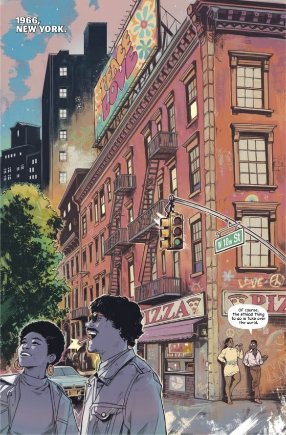 Despite not seeing what fully occurred between 1966 and 1999, Gillen gives glimpses into the Nuclear Family’s previous identities and how they have changed over time. Lux still carries the self-imposed burden of desiring to be the “ethical” figurehead of the six but hides his intentions much close to his chest. Conversely, Heavy continues to uphold his fiery counterculture attitudes but has accepted that he has made mistakes and to learn from them. Neither are paired as complete opposite binaries of each other but exist as complementaries. Eschewing the notion of a simple “hero” or “villain,” Gillen presents us with flawed and human individuals doing their best to hold onto what they have with the power they hold and how they want to influence the world. Yet the difference between them lies in how they accept their guilt and the damage they have done.