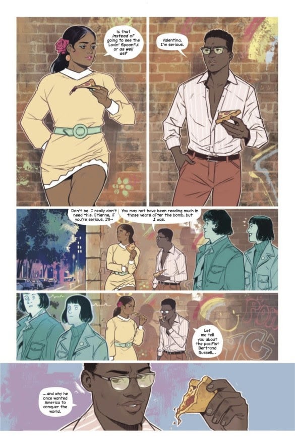 The art by Wijngaard is a real standout with its vibrant colors and captures a stylized fictional version of the past. And I love his character designs for the six Atomics, where they each have a distinct vibe that says everything about their character just by looking at them. The six Atomics are instantly iconic and feel different from the standard superhero fair while reflecting the various periods of history they exist in. Outside of the fantastic aesthetics, his drawing and paneling make Gillen’s already engaging script into an even more engrossing comic combined with Clayton Cowles’s seamlesslettering.