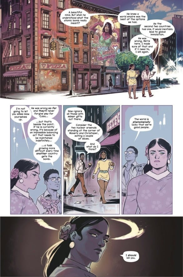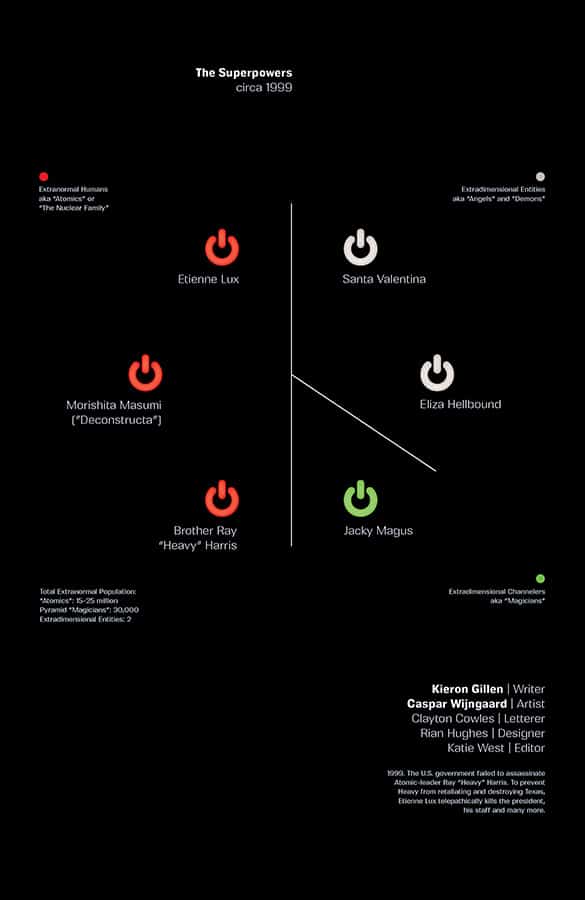 Then comes Gillen exploring the existential horrors and fears of nuclear arsenals and how they serve no other purpose except to end all of life. With them coming into conflict, signaling the destruction of the world, all they can do is find a way to co-exist to deter the potential armageddon. Gillen examines how one false move by an Atomic could create a domino effect and destroy the planet. Even to this day, the nuclear shadow of death hangs over us, where all life as we know it will be gone due to the press of a button. And with the series set in the past, specifically in 1999, he draws attention to the fear of Y2K, where the approaching millennium would mess up computer clocks and accidentally launch warheads. Despite us being in 2024, Gillen wants to demonstrate how those weapons still hang over us and threaten us even if we do not think about them as much as we did in the twentieth century.