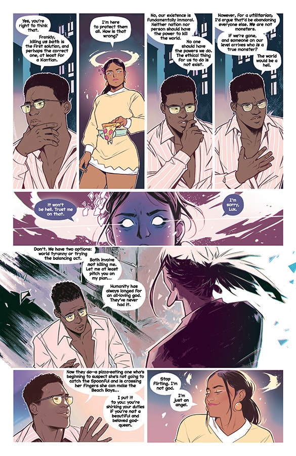 Picking up in the aftermath of the climactic confrontation in the previous issue, Gillen and Wijngaard let things breathe but never truly absolve the pressure hanging above the characters. No matter how hard they try, the characters cannot stop the doomsday clock and prevent the future from happening. Essentially, they are delaying the inevitable death and destruction that will arise one day from them using their powers against each other. Their relationships and personas exist as a sort of theater to keep the desired peace and to prevent each other and humanity from lighting the metaphorical and literal fuse. Wijngaard’s artistry of body language and facial expressions sells so much of the unspoken drama that weighs upon them. Their conflict cannot be solved by violence or fighting but by constant discussions, agreements, and politicking.