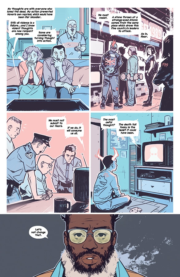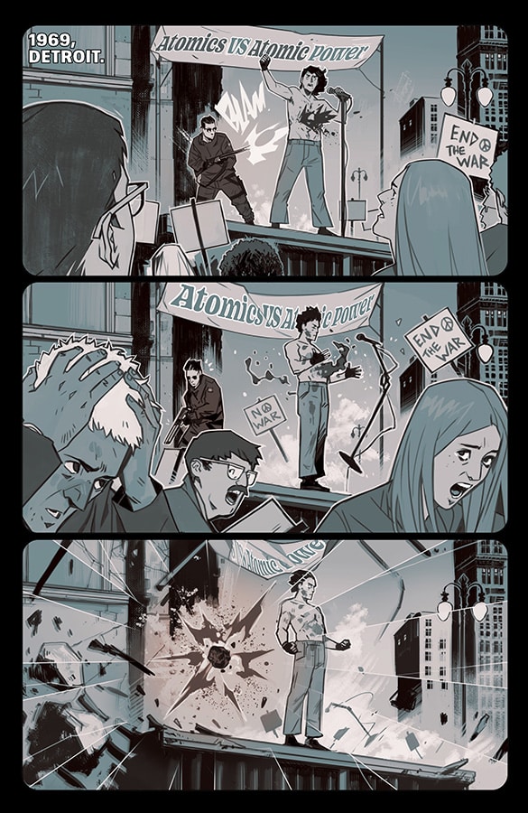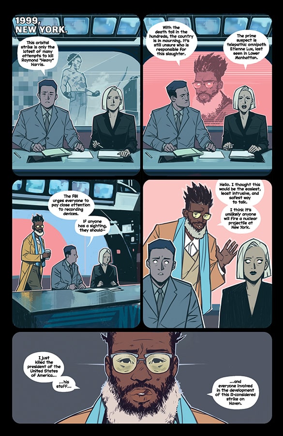 With the setting being an alternate history period set in 1999, Gillen and Wijngaard expertly build the world where they give enough context clues for readers to seamlessly understand what has been going on while fleshing it out thoroughly. From slight hints in Gillen’s writing to background dressing and clothing drawn by Wijngaard, they have thought about every detail of how the Atomics’ appearance and presence impacted the world, from major to minor. Even hints of past events serve as vital elements to explaining how much their history diverged from our own and how their existence would influence everything from public opinion to government responses to pop culture. Even though The Power Fantasy #1 may not exist in the same reality as ours, certain aspects of our own can still be found, making their world a skewed version of our own.