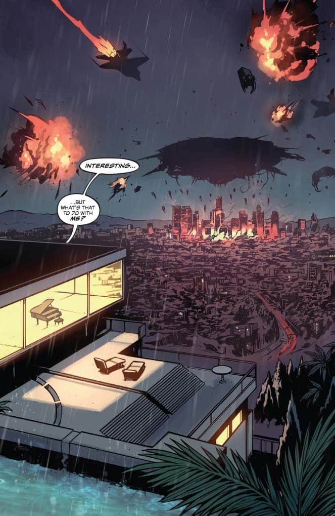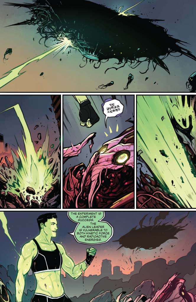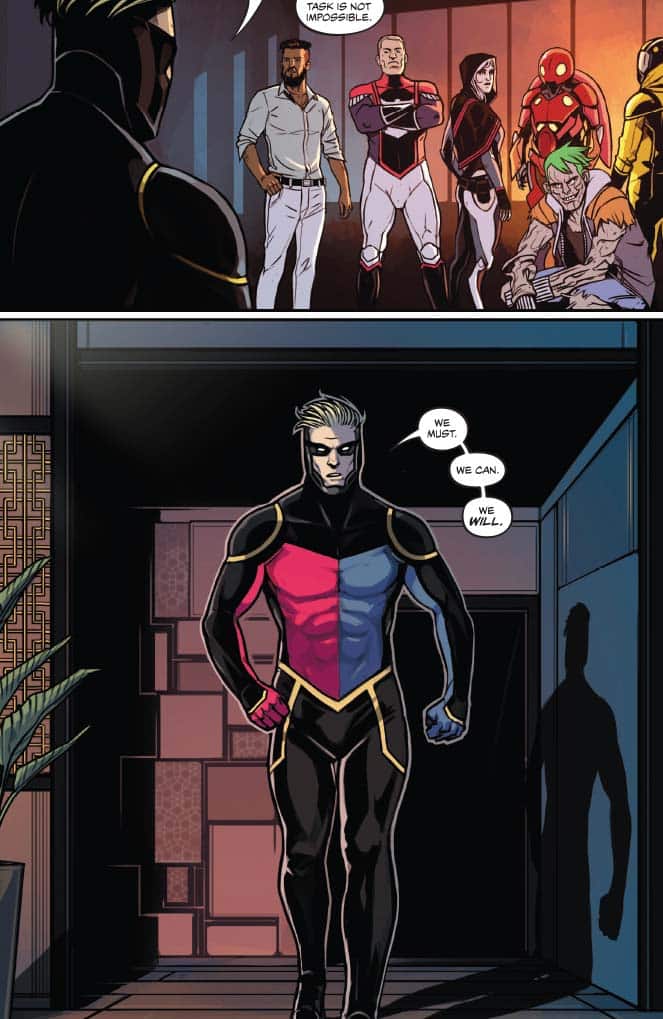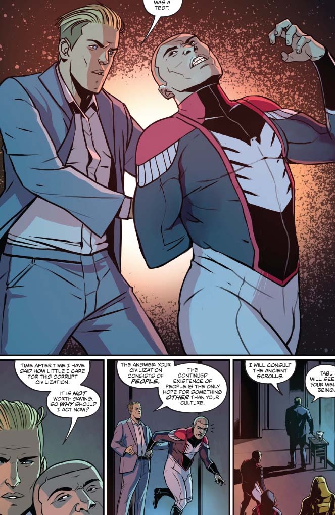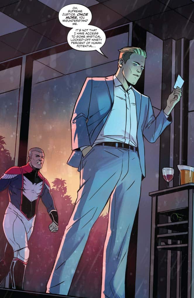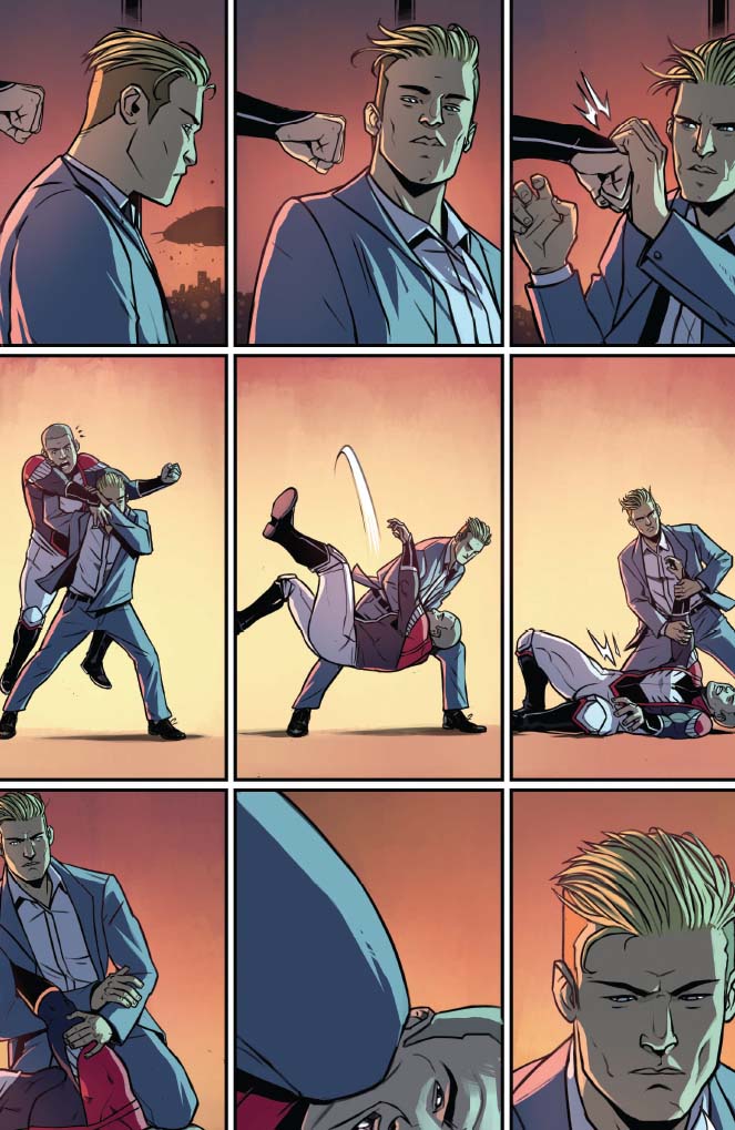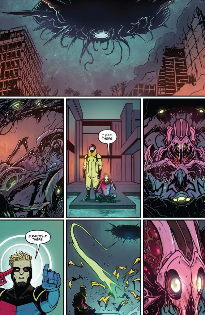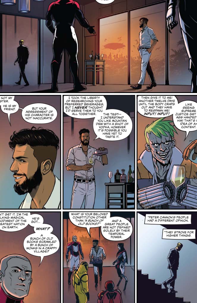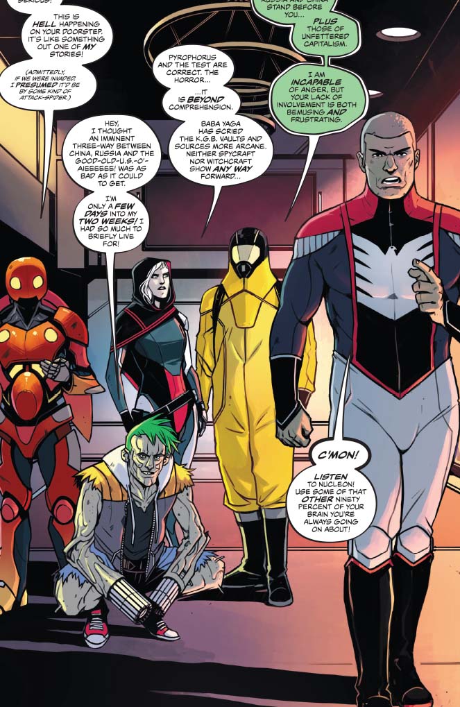 On the more cynical side, the big action scene where Peter Cannon successfully masterminds a defeat of an alien invasion and unites disparate superheroes from the United States, Russia, and the corporate world shows the hollowness and repetitiveness of the bicker, fight, and team up against a greater, external foe formula. Peter doesn’t have a complex plan; it just involves hitting aliens in the right place with the right amount of force like a miniboss battle although these aliens wiped out the population of an entire city. And this force is depicted is some widescreen Bryan Hitch meets the disciplined grid of Dave Gibbons or Mitch Gerads by Caspar Wjingaard. Mary Safro’s palette for the aliens is stomach churning queasy in contrast with most of the heroes’ strong profiles. (Mountain dew vodka chugging and two week living The Test is a notable exception.