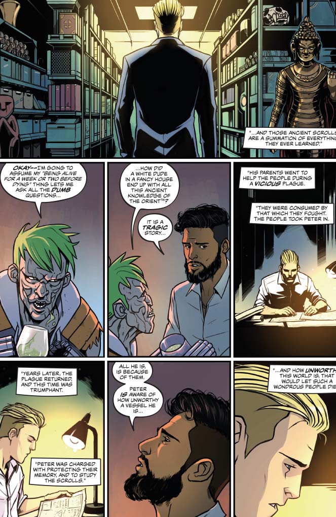 Peter Cannon’s “teammates” spout platitudes about avenging and banding together, but he sees the bigger picture. His mystic scrolls are superhero texts, and he knows that especially in modern comics (The works of Bendis, Hickman, and Johns spring to mind, for better or worse.), there’s a bigger, secret force pulling the strings. Villain of the month is dead, long live villain of the six issue story arc that feeds into the summer crossover or a multi-year run. With the exception of the crossover part, Kieron Gillen does do this with his plotting and gives Peter Cannon #1 an intriguing, if purposefully derivative antagonist that should elucidate more of our protagonist’s actions and moral compass. And isn’t that what any good supervillain can be expected to do?