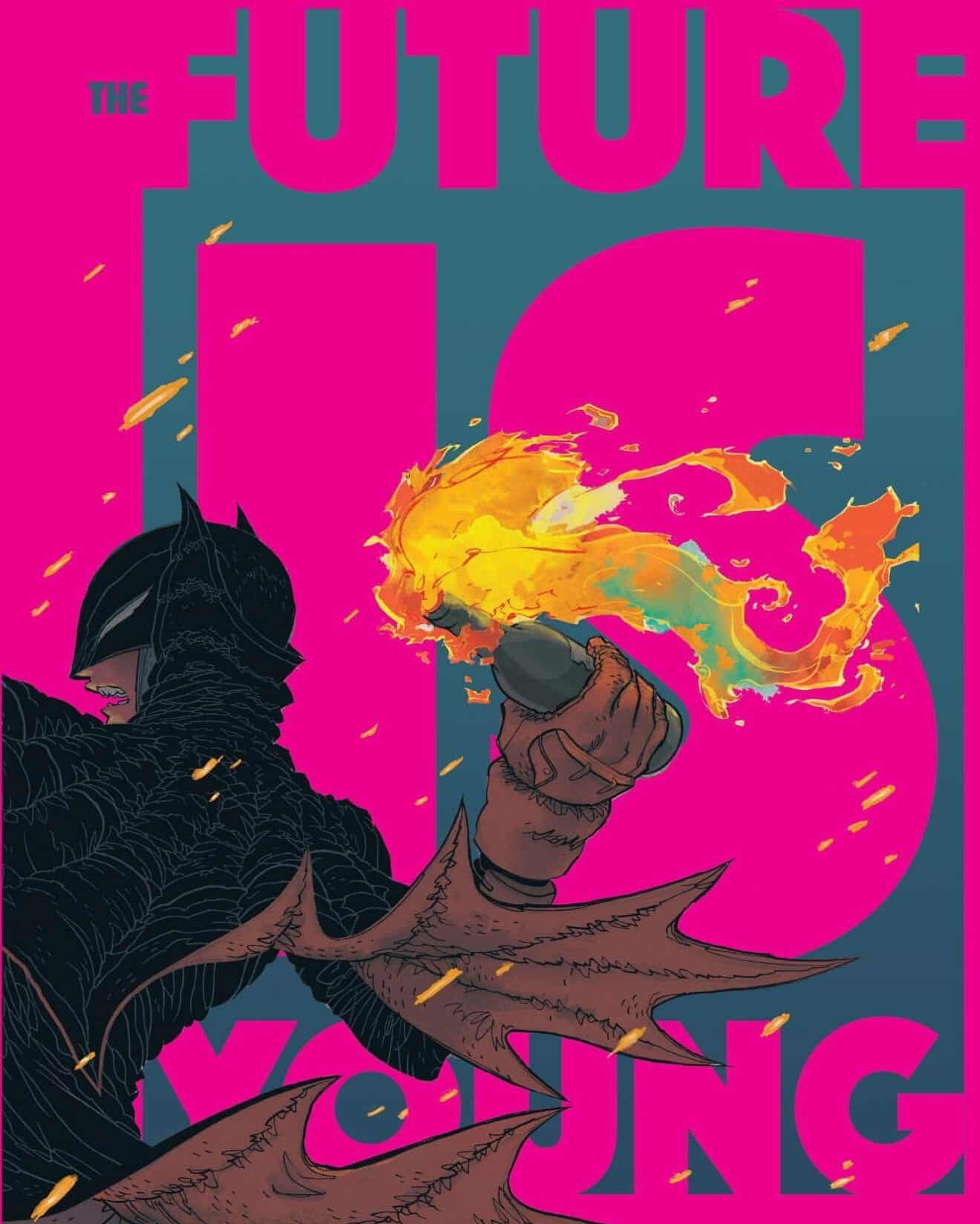 Artwork by Rafael Grampá features Carrie Kelly as Batwoman throwing a Molotov cocktail with the text “The Future is Young.”