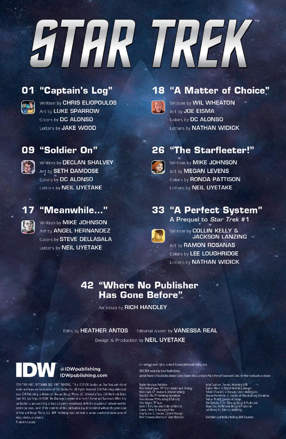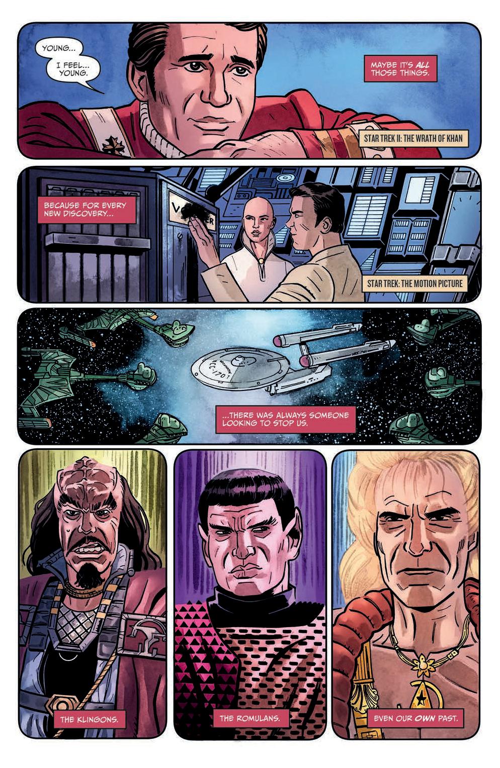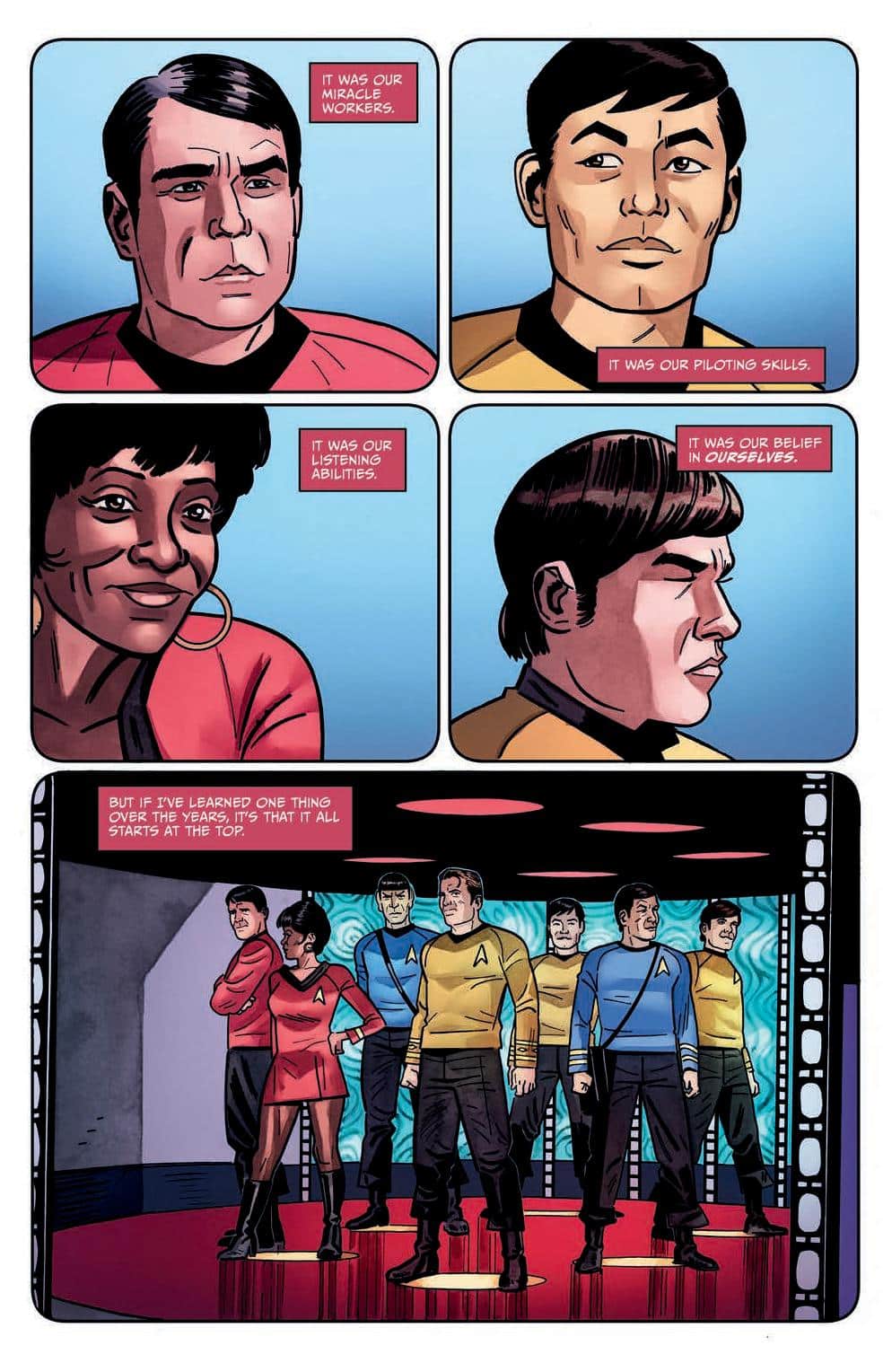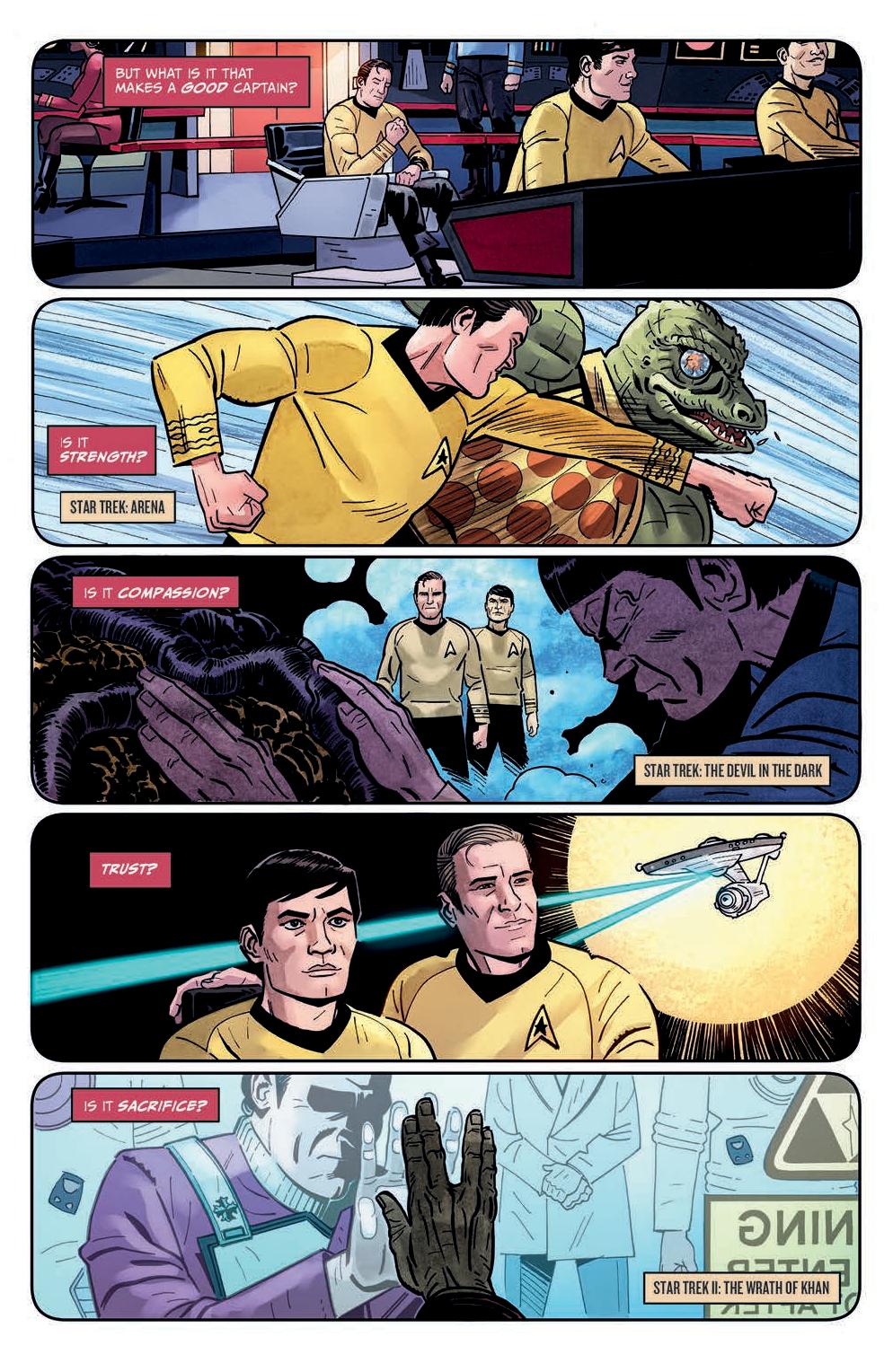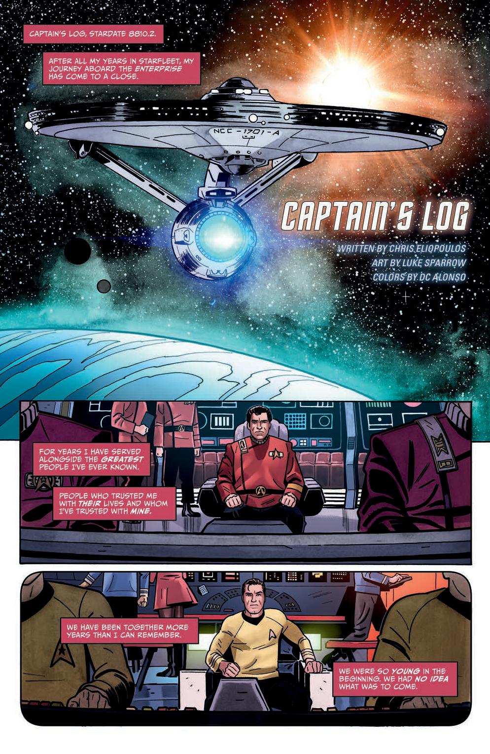 In “Captain’s Log”, we find Kirk as he writes final Captain’s log, as he recalls what would a lifetime of memories. In “Soldier On”, We find O’Brien as he foils a Cardassian spy, alerting their military, that Starfleet is a formidable foe. In “Meanwhile”, Scotty wakes up from a nap to notice that no work has been done, and decides his day is already done. In “A Matter of Choice”, we find out exactly where Wesley Crusher has been all these years and how did he end up being a guardian of time. In “Starfleeter”, we find a young Keyla Detmer as she bonds with a young Klingon warrior, eventually becoming friends. In “A Perfect System”, a sentient being name Gary Mitchell realizes the mission of Star Trek makes his existence, none essential, as it is in good hands. In “Where No Publisher Has Gone Before”, the impact of the franchise in comics is told .