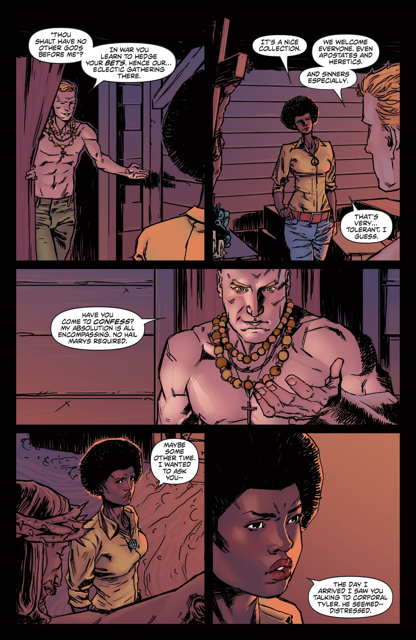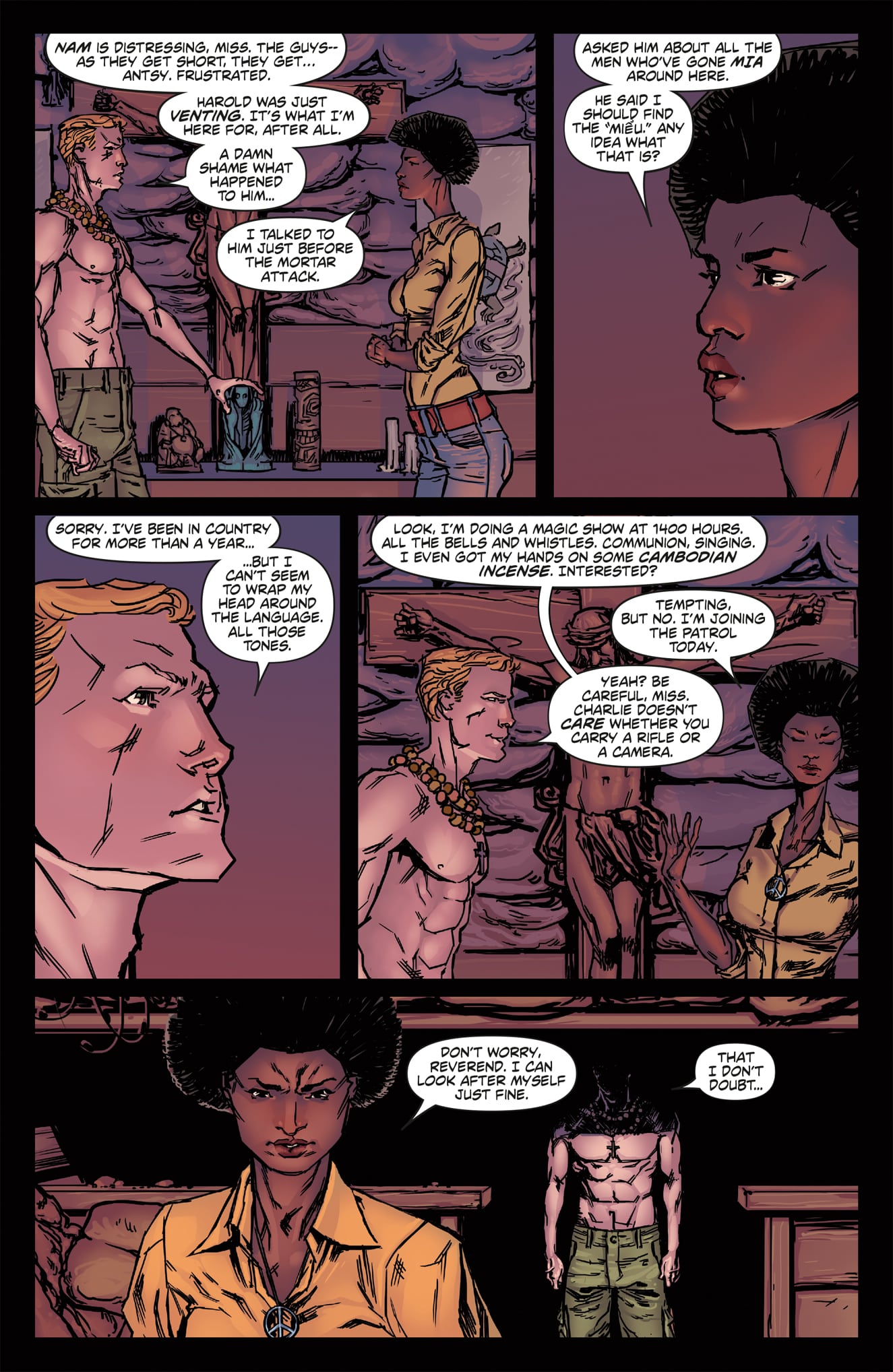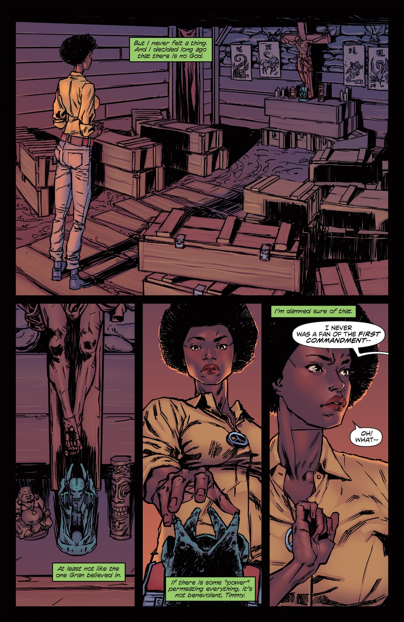 The art itself also helps to create an interesting world for Faith to run through. At the issue’s beginning, dialogue is very minimal, which allows the narrative to fully display the free running abilities that the Mirror’s Edge video game became famous for. When Faith is in motion, her movements seem quick and natural. There is a fluidity as she moves from jumping off a rooftop to sliding under a row of pipes. The cityscape also helps build the idea of motion, with every rooftop seemingly designed as a unique free running course to be tackled by the runners. The one place the artwork did miss an opportunity is in the interior designs and more intimate moments. Many rooms lose the futuristic look that the exterior world has and, it breaks the environment down into two distinct entities, rather than one cohesive unit where one looks like an extension of the other.