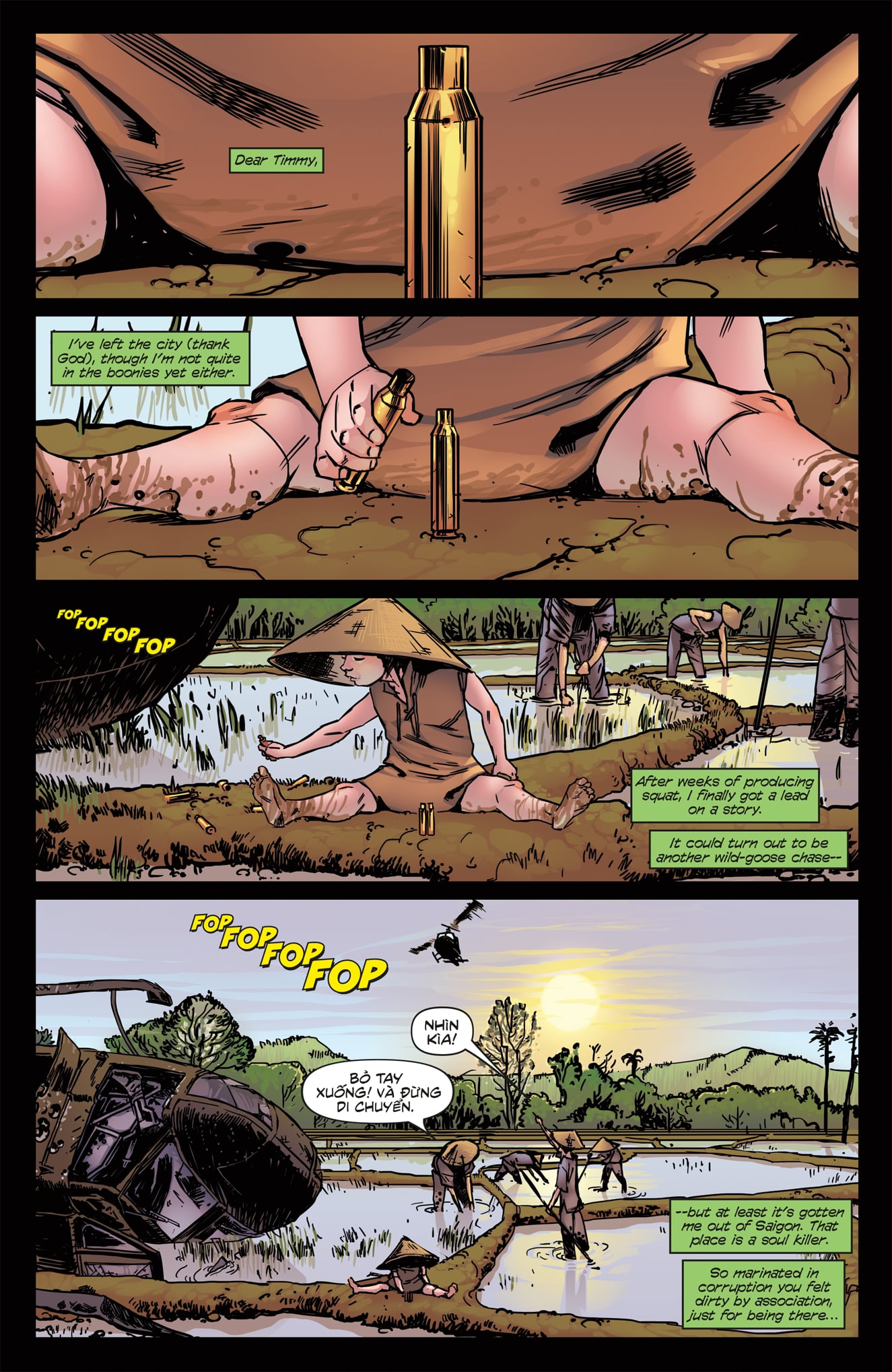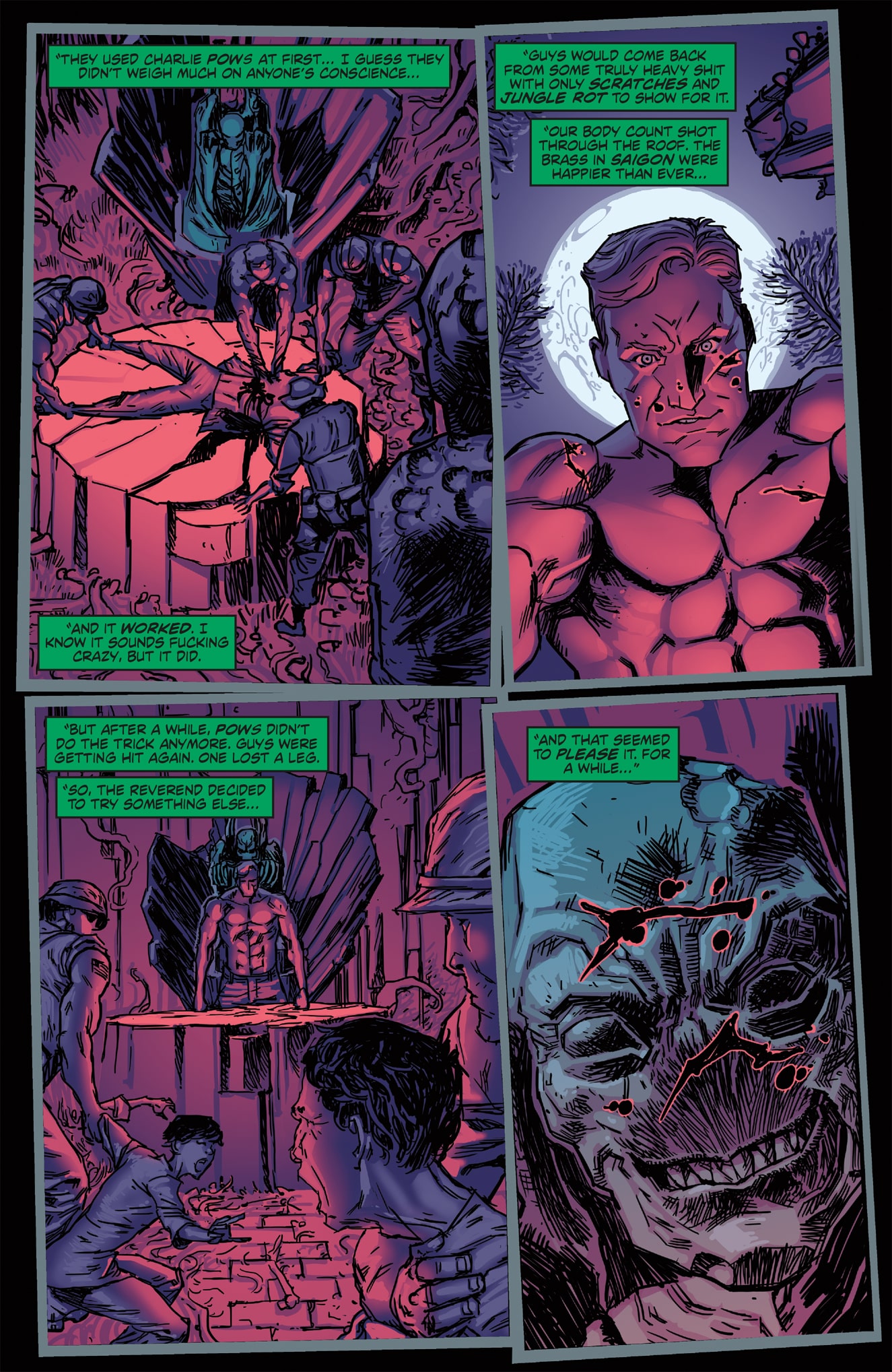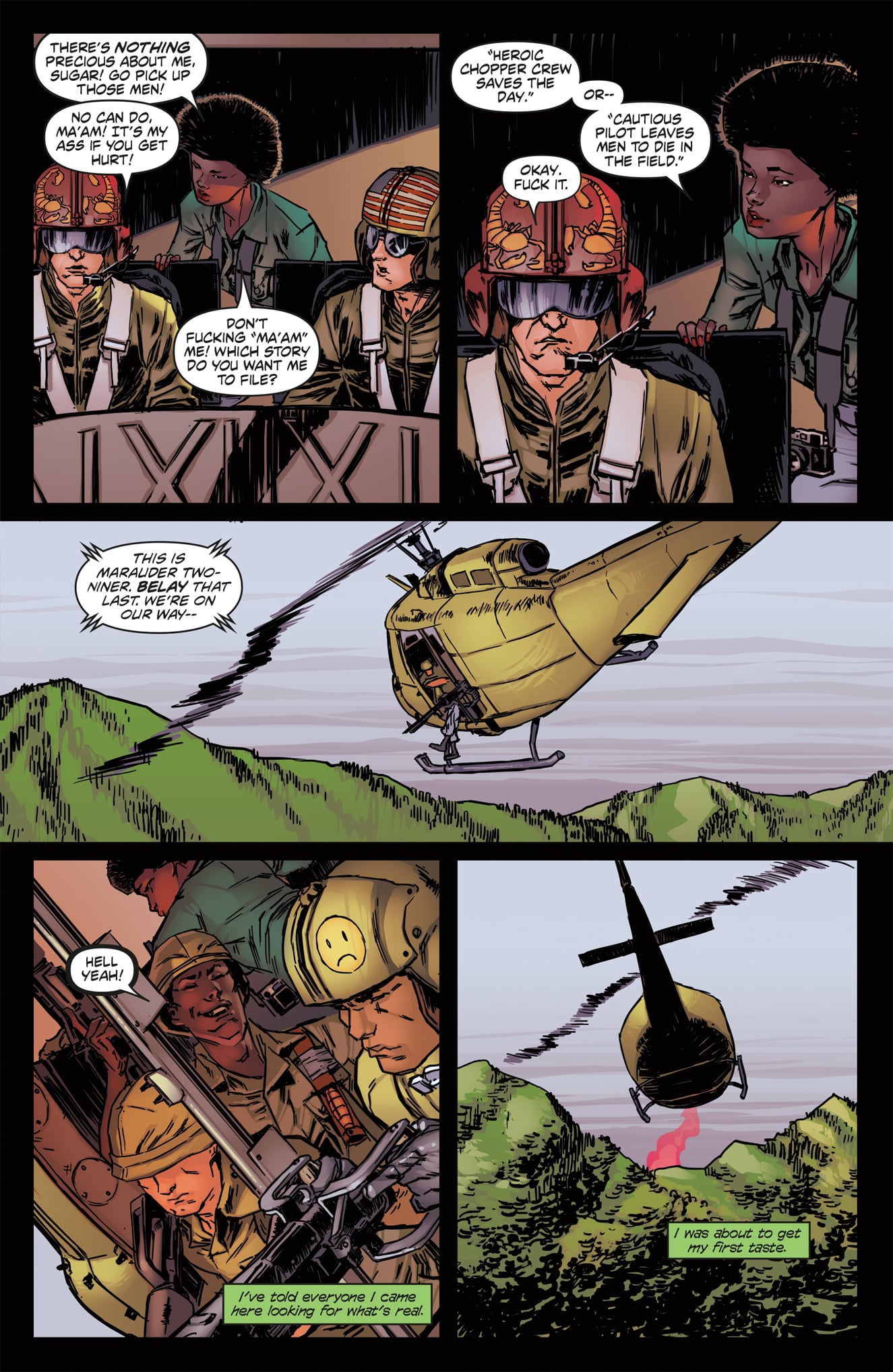 The art itself also helps to create an interesting world for Faith to run through. At the issue’s beginning, dialogue is very minimal, which allows the narrative to fully display the free running abilities that the Mirror’s Edge video game became famous for. When Faith is in motion, her movements seem quick and natural. There is a fluidity as she moves from jumping off a rooftop to sliding under a row of pipes. The cityscape also helps build the idea of motion, with every rooftop seemingly designed as a unique free running course to be tackled by the runners. The one place the artwork did miss an opportunity is in the interior designs and more intimate moments. Many rooms lose the futuristic look that the exterior world has and, it breaks the environment down into two distinct entities, rather than one cohesive unit where one looks like an extension of the other.