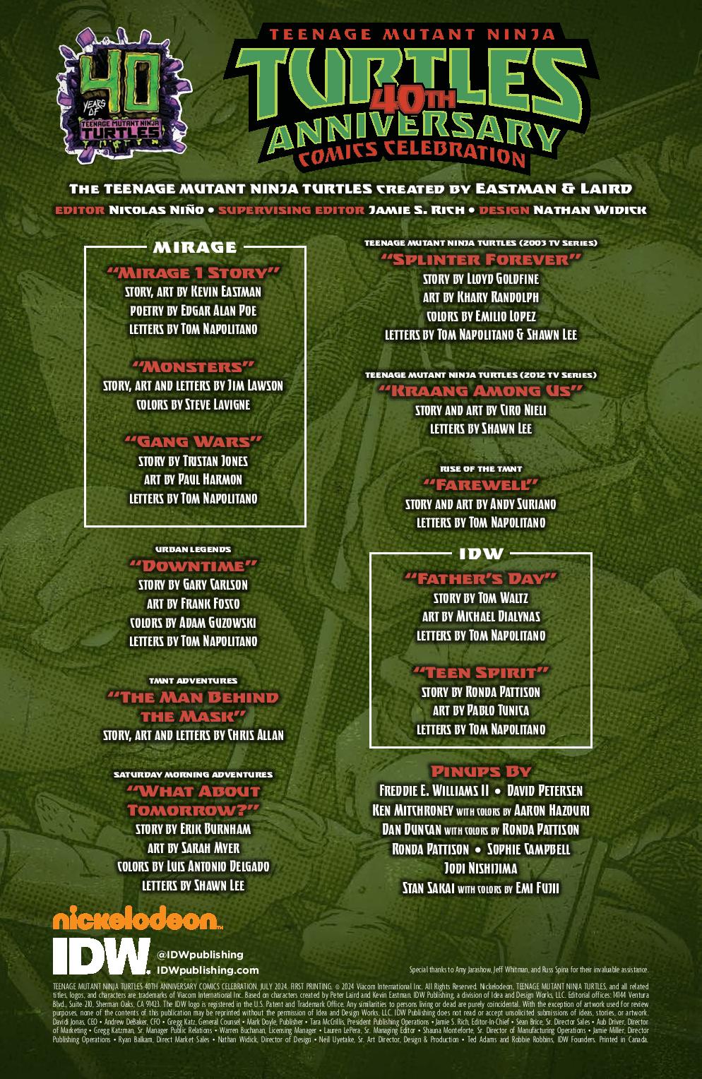 Art: Kevin Eastman, Jim Lawson, Paul Harmon, Frank Fosco, Chris Allan, Sarah Myer, Khary Randolph, Ciro Nieli, Andy Suriano, Michael Dialynas, Pablo Tunica, Freddie E. Williams II, David Petersen, Ken Mitchroney, Dan Duncan, Ronda Pattison, Sophie Campbell, Jodi Nishijima, Stan Sakai