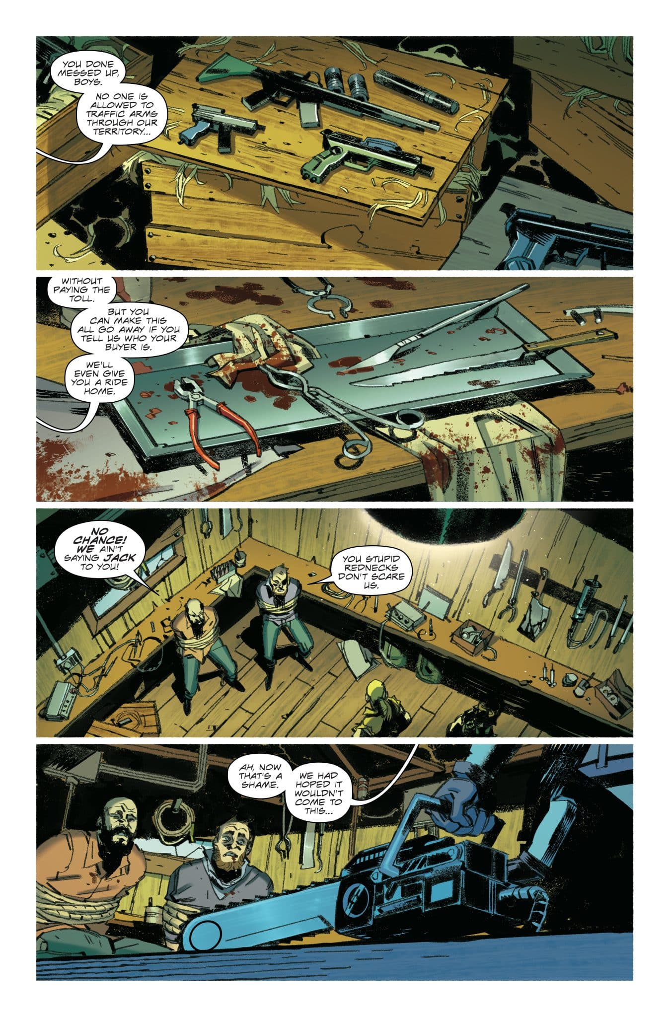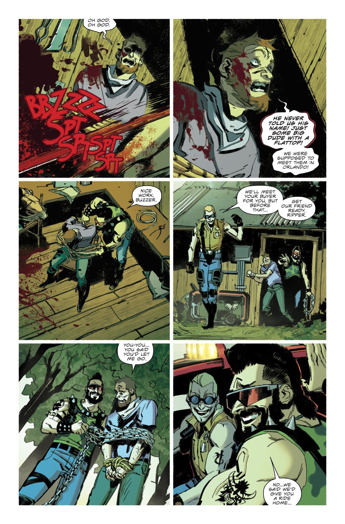 But, what makes Cobra Commander #2 really stand out is the introduction of the Dreadnoks. It’s not the full group, only giving us a few members, but this version is a group of arms dealers that seems like it’ll put them into conflict with Cobra Commander as well as Destro in the future. But, the conflict with Cobra Commander is here in this issue as to the two groups trade fire and more.