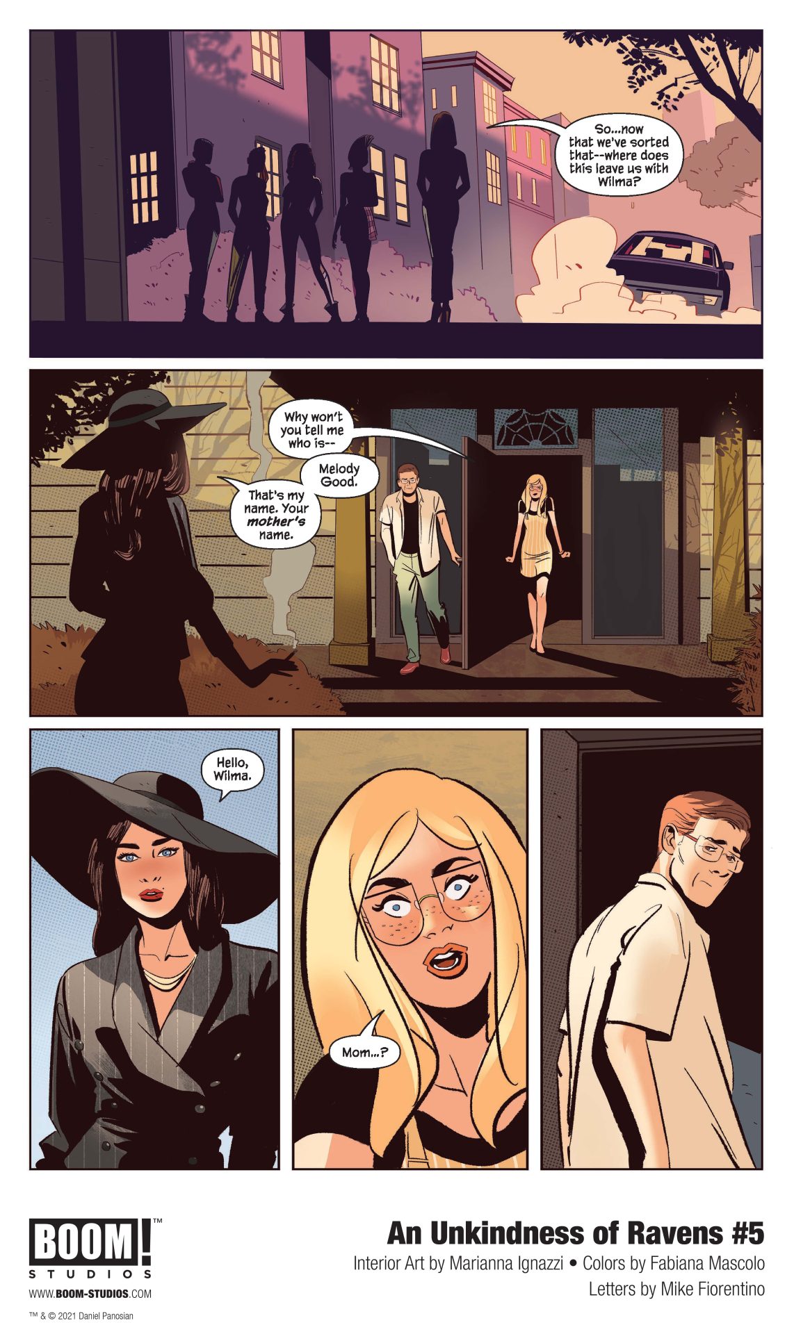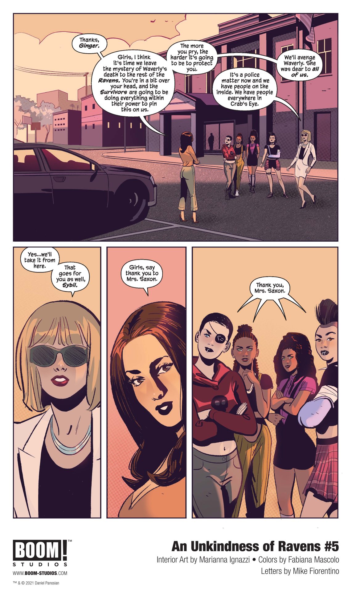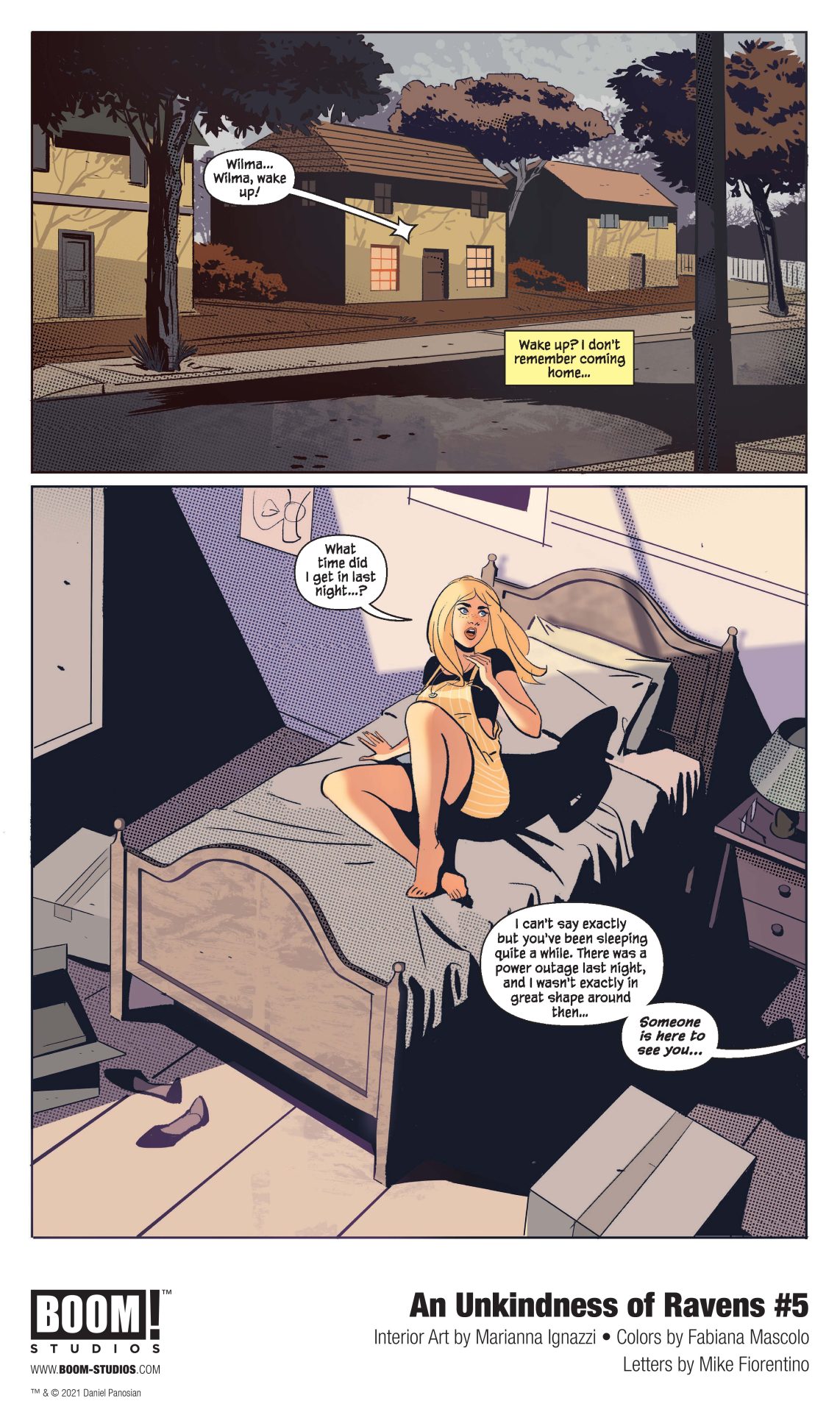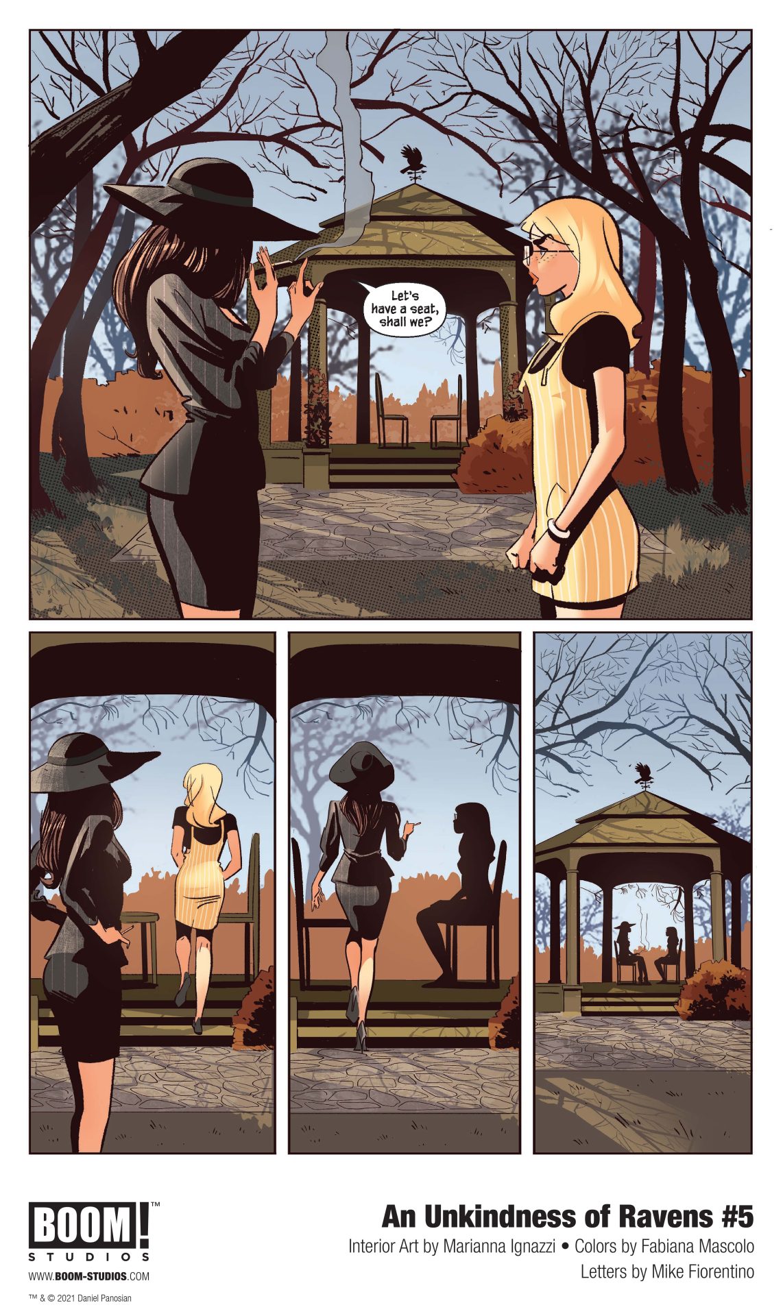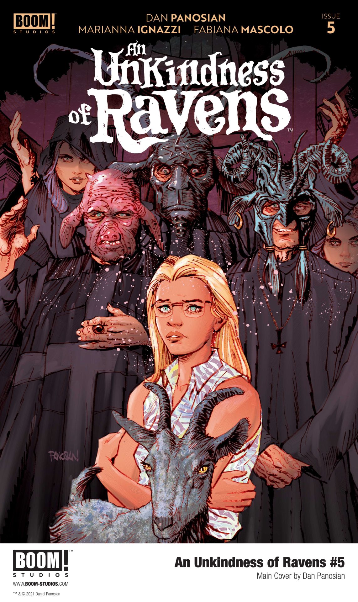 BOOM! Studios has revealed a first look at An Unkindness of Ravens #5, the series finale of the original series from acclaimed comics creator Dan Panosian, artist Marianna Ignazzi, colorist Fabiana Mascolo, and letterer Mike Fiorentino, a supernatural mystery about a group of high schoolers steeped in witchcraft and the town they live in filled with long-hidden secrets and unchecked power. Available on January 27, 2021.
