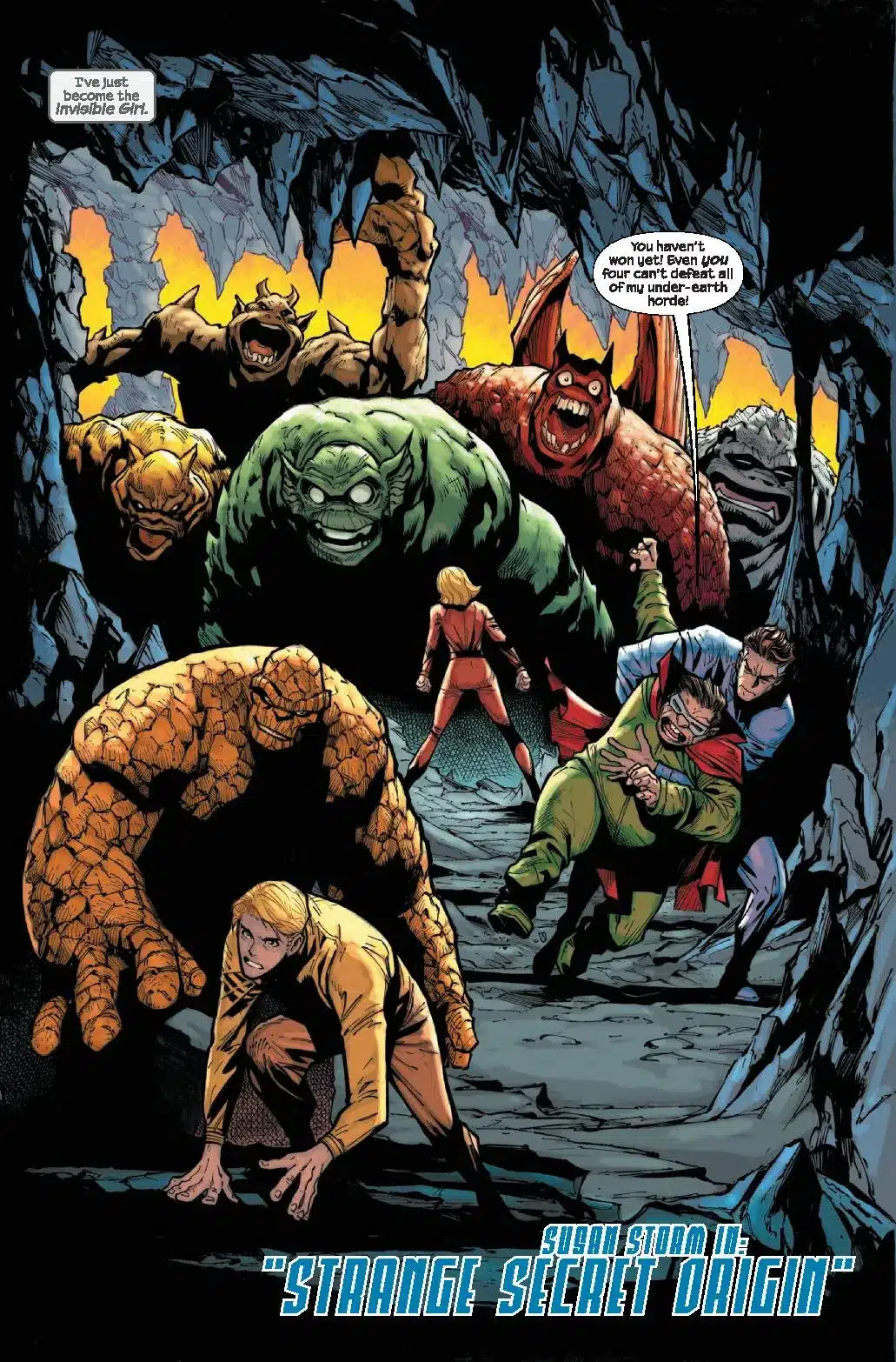 It’s back before everything changed, and I’m still in grad school — just a kid, really. My name is Susan Storm, and I’ve just become the Invisible Girl. Our first encounter was with the Mole Man — he was the first time we found it necessary to use our powers, to truly become the Fantastic Four. Reed prayed it would be the last. But his prayers weren’t the kind that got answered. What happened next wasn’t what I thought would happen — it wasn’t what any of us thought would happen. I want you to know that I tried. I really did. I didn’t mean for things to end up the way they turned out. But there are some mistakes you can’t take back. And there are some wounds that don’t kill you, even though they should…