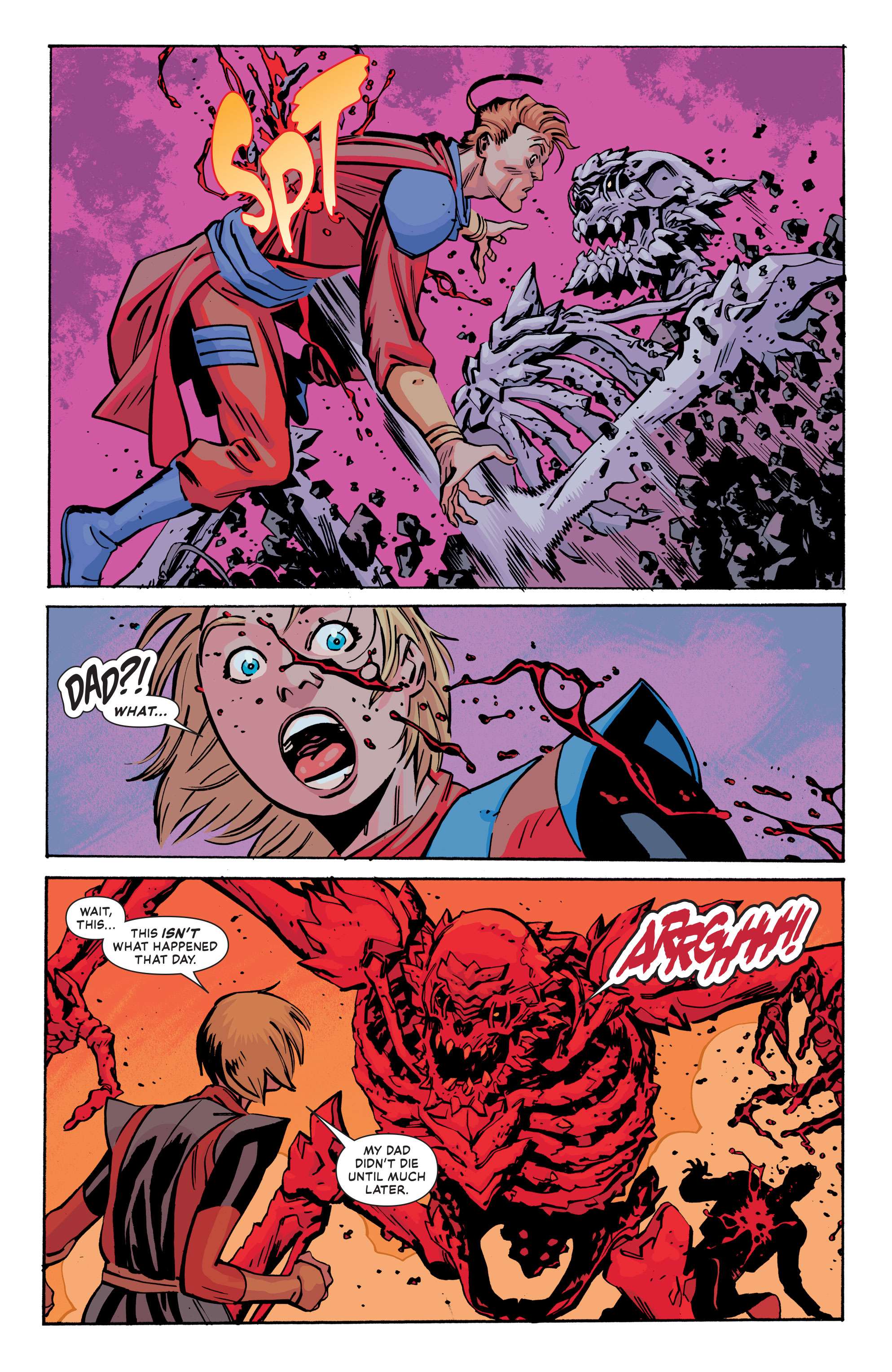 The art by Javier Garron, colored by Morry Hollowell is action-packed and fabulous. There’s some action here that took my breath away. The colors are bright and heavy and the page layouts smart and dynamic. If I had one complaint it would be the fact that Garron tends to draw everyone very young. It’s a little bit jarring when older characters like the Blob or reporter Ben Urich look like fresh-faced twenty-somethings. Overall though the art more than delivers great action and stunning visuals.