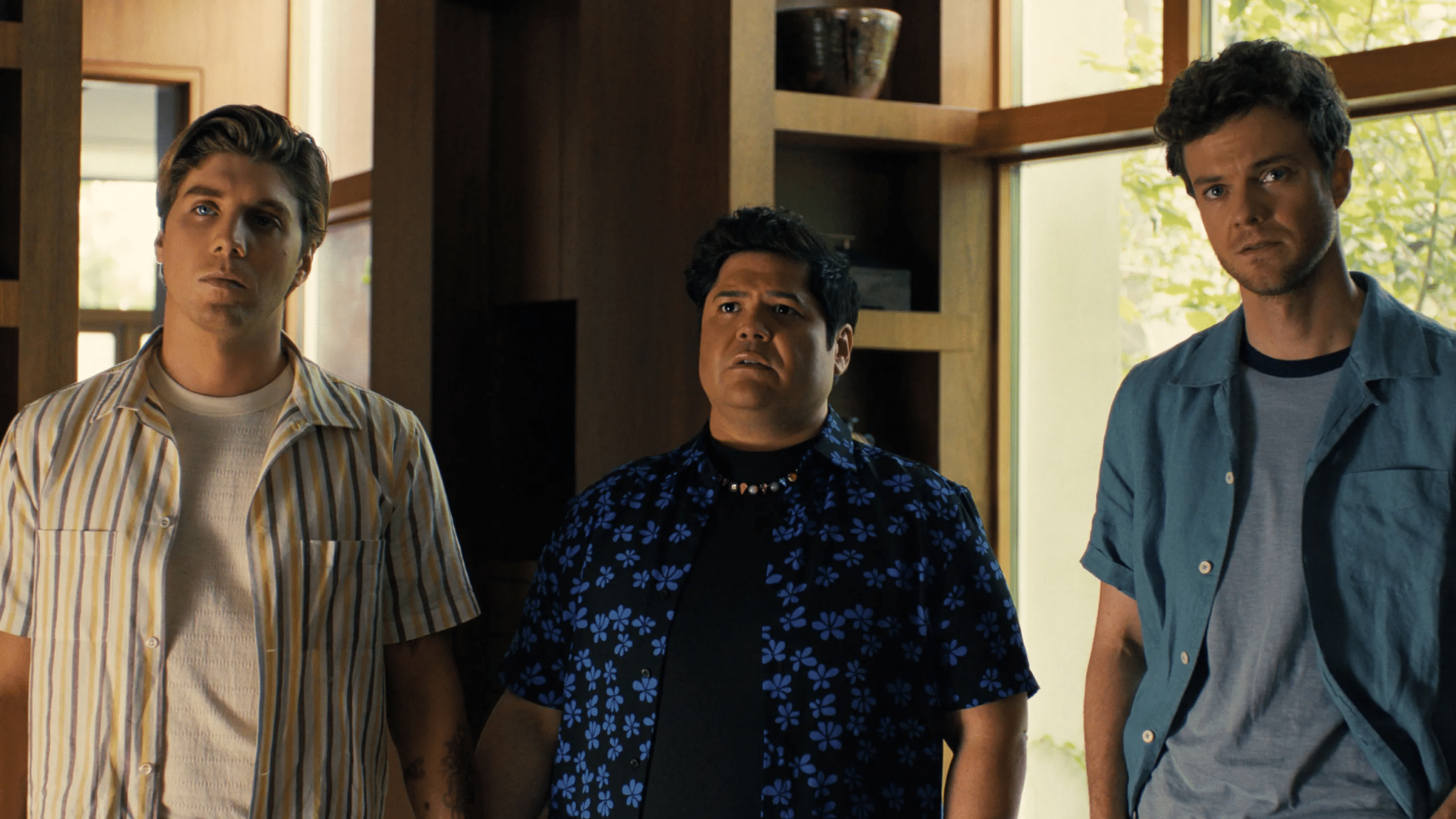 This is established through an adorably specific meet cute of them meeting at a Halloween party where an over-the-top Dracula costume sporting Patrick accidentally steps on Eli’s dinosaur costume tail, they lock eyes, and fall in love. Even Guillen and Gage’s body language while telling this story sell the adorableness of the moment before we get to see it in flashback. On the other hand, Iris and Josh’s “meet cute” makes Nicholas Sparks look like a literary genius. Of course, he literally just picked it from a drop down menu, and there’s no actual connection or similarities between Josh and Iris beyond them joking about the AI on Josh’s self-driving car, or that Iris can tell the weather in a very precise manner. Iris is just a means to an end for Josh whether that’s killing a wealthy Russian man for money, or an outlet for his sexual desires. There’s one mercifully brief sex scene between Josh and Iris in Companion, and he has a very loud orgasm and immediately uses a sleep command on Iris without even caring about her needs or pleasure. He’s definitely not Joaquin Phoenix’s character in Her and has no inner life. Jack Quaid weaponizes the affable everyman vibe that made him a great POV character in The Boys to be the worst (and most pathetic villain) of all.