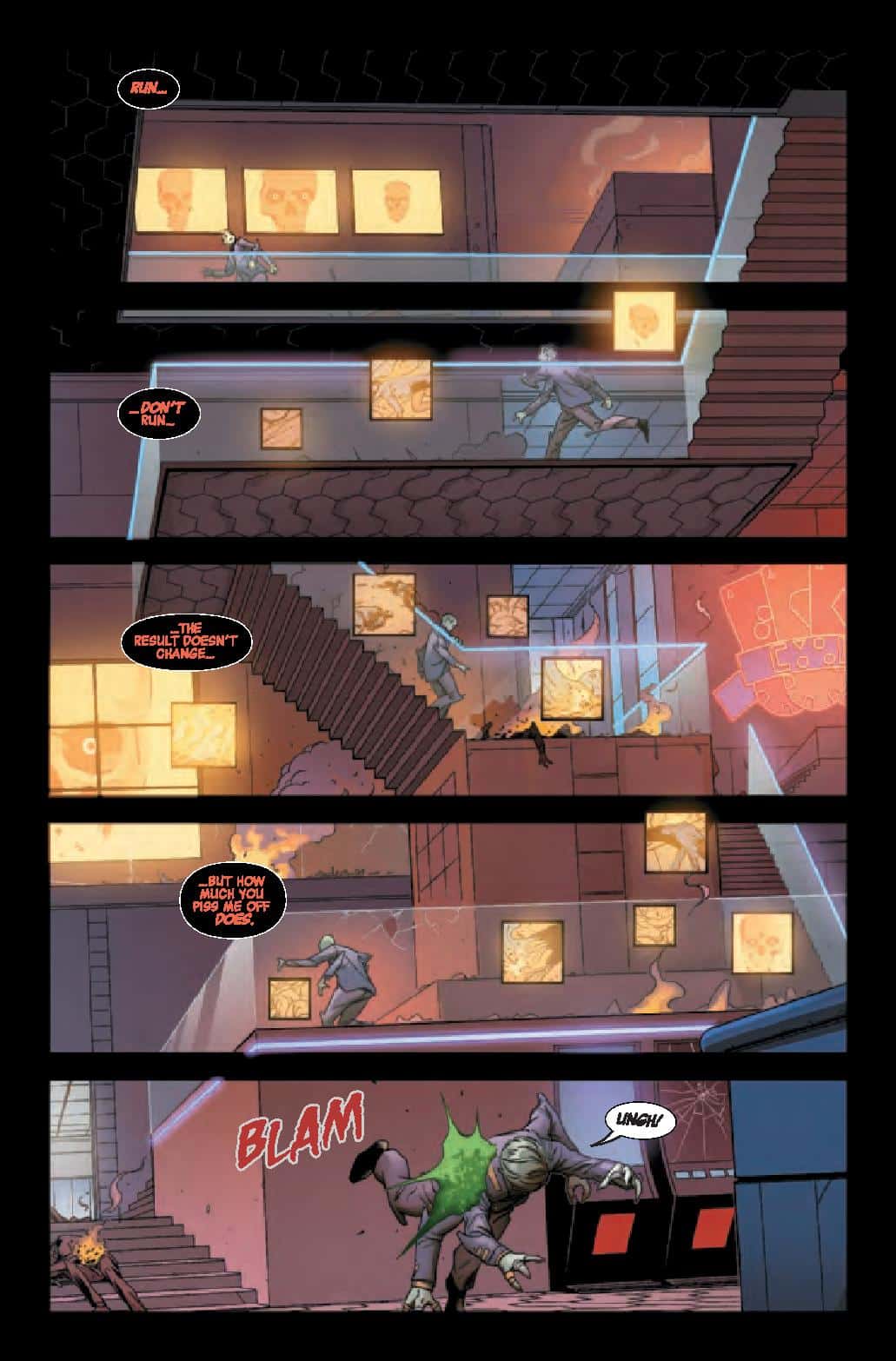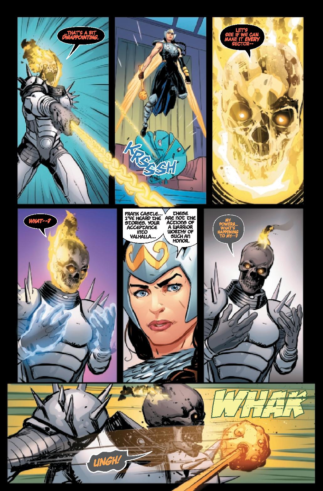 Phillips does double duty in writing though with a second story dubbed “Cosmic Ghost Stories”. With art by Jonas Scharf, color by Arif Prianto, and lettering by Lanham, the second story continues some of the themes from the first, the haunting of Frank Castle. We’re taken through his life as he confronts the horrors of the past. It’s a solid way to catch up readers on the major things they need to know, an easy and entertaining way to info dump. It’d be nice to get some more of this with key moments in the character’s existence, even throwing in tidbits that might not have been revealed before.