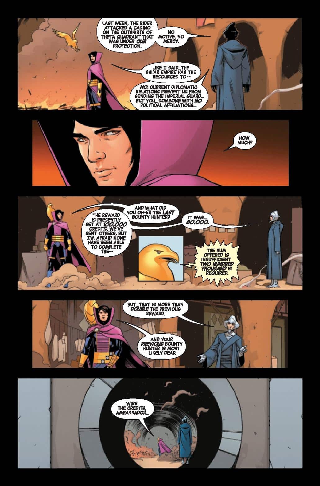 Writer Stephanie Phillips delivers an opening chapter that is a western in space. A man is haunted by his past and wants to find peace but is dragged back into action. It’s a story we’ve seen many times, over and over and they usually follow a familiar beat and pattern.