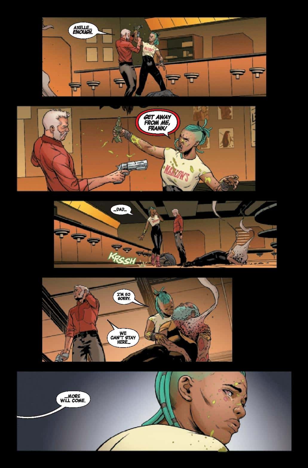 The art by Juan Cabal is interesting. With coloe by Espen Grundetjern and lettering by Travis Lanham, the style fits the “futuristic western” setting nicely. There’s a little Bravestarr to it but overall it captures an old man trying to find peace without becoming too dark and depressing. Frank might be a little too clean, overall everything is, but small details gives a good sense about this world and the life Frank is living.