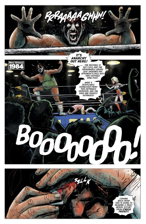 The art by Alex Cormack delivers all the action and drama with a dark cloud hanging over it all. Ashley Cormack provides the colors with lettering by Hassan Otsmane-Elhaou. The style of the comic delivers a flair for all the characters that creates larger than life characters but at the same time does so in a small time promotion sort of way. Each character has a look and style that tells a story by itself. The wrestling action is captured really well. There’s a lot of emotion as well that plays out in the panels.