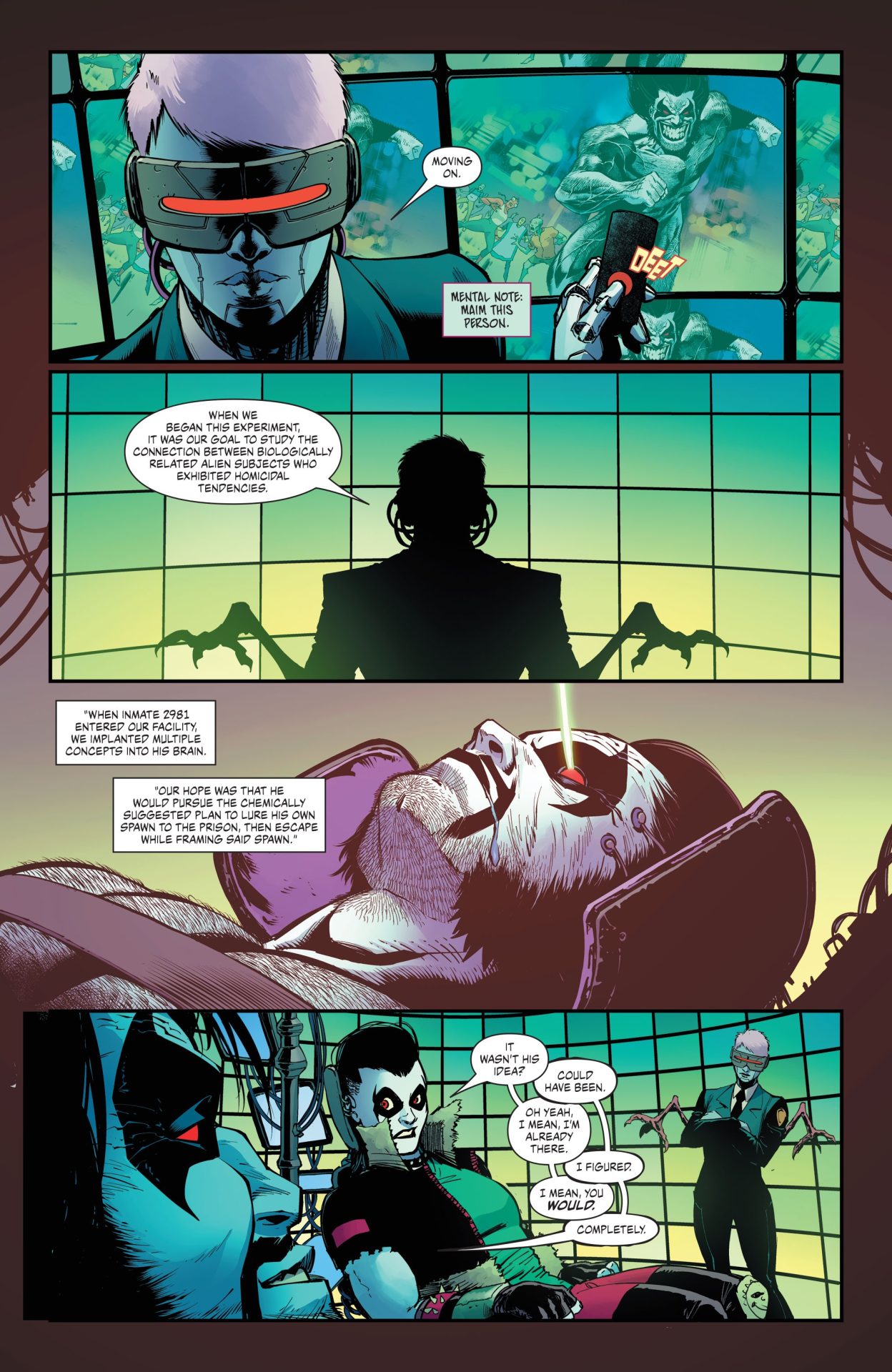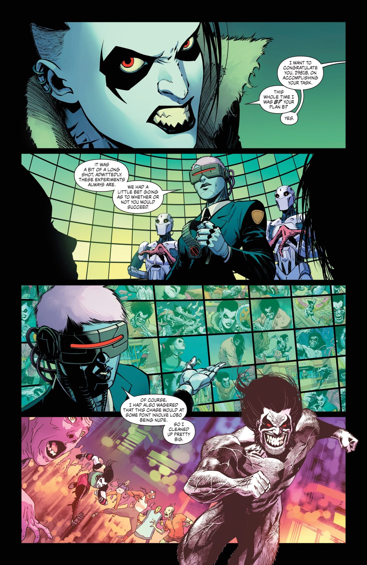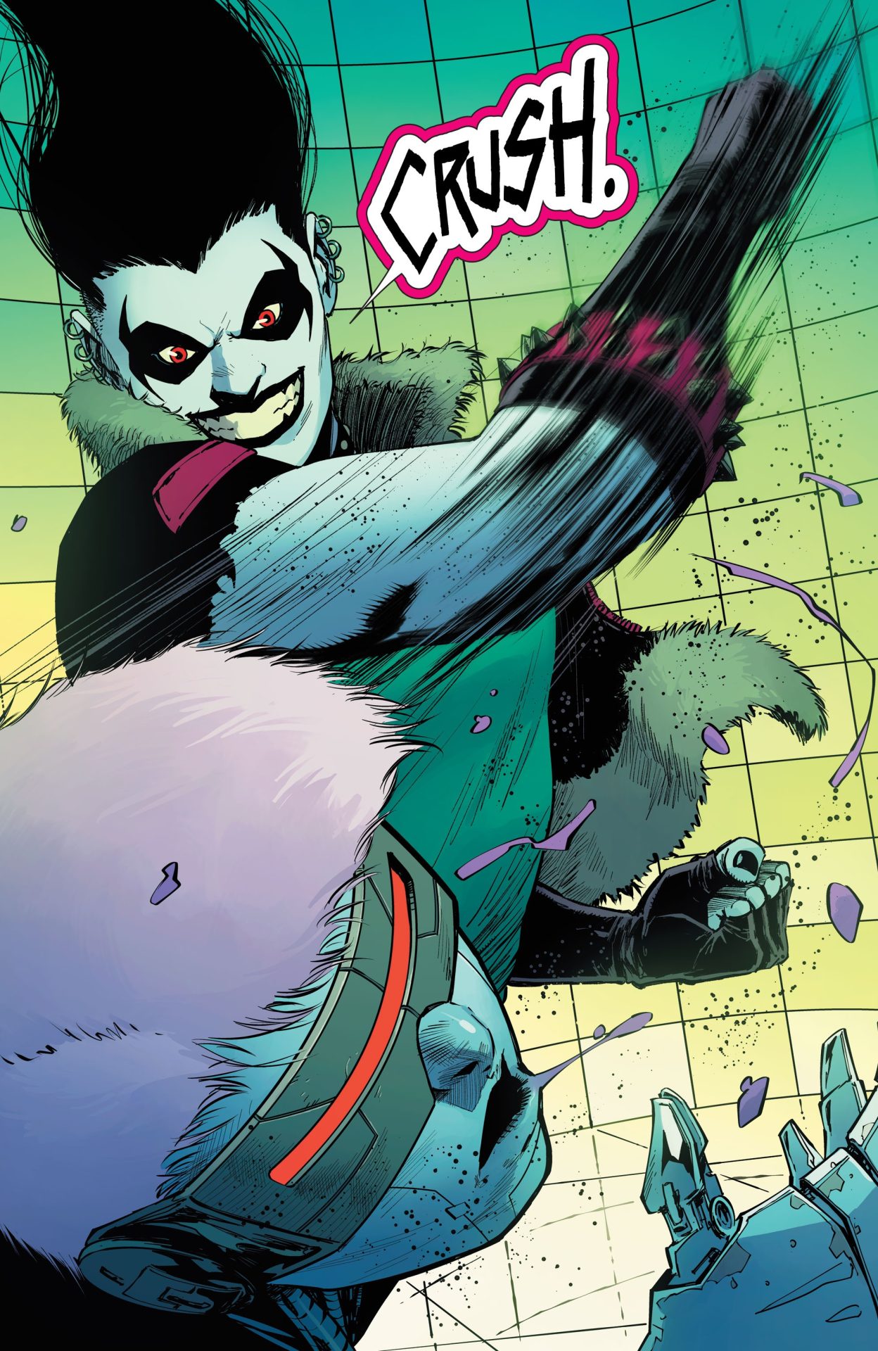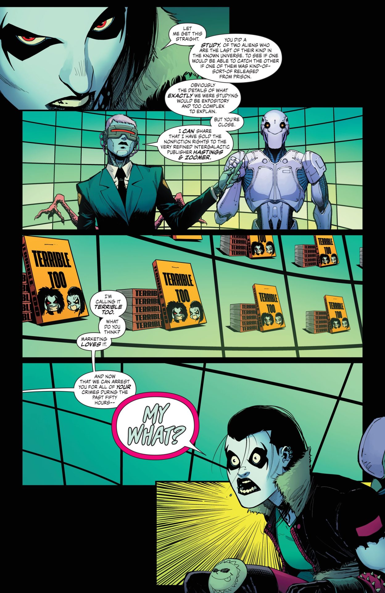 Even if Crush and Lobo end up punching a lot of robot therapists in the head with colorful blood effects from Bonvillain, Crush and Lobo #8 takes a fair and smart approach to therapy that Crush applies to her own experience with clairvoyant aliens and Katie, who goes to therapy. It’s not about being the subject of a book or science experiment or a lost cause, but about learning about yourself and coping mechanisms from an intuitive, well-trained third party aka not the robots in Lobo’s prison. Change is difficult, but still doable, especially in small ways. This applies to Crush and Lobo as Tamaki and Nahuelpan don’t make sweeping changes to Crush’s status quo (And as the more well-known of the pair, Lobo is an incredibly static character.), but have her make small changes and do-overs. For example, she’s honest about her feelings towards Katie and drinks coffee like a regular customer instead of blowing up the space coffee shop. Crush isn’t going to be a paragon of good any time soon, but her messiness and the fact that she might actually give a shit underneath the quips and cool exterior is what makes her a character that I could connect to and can definitely anchor her own series.