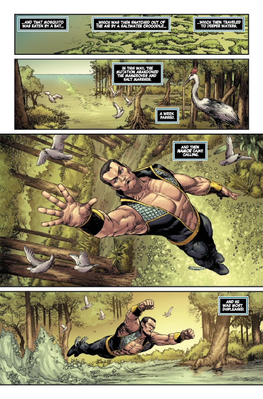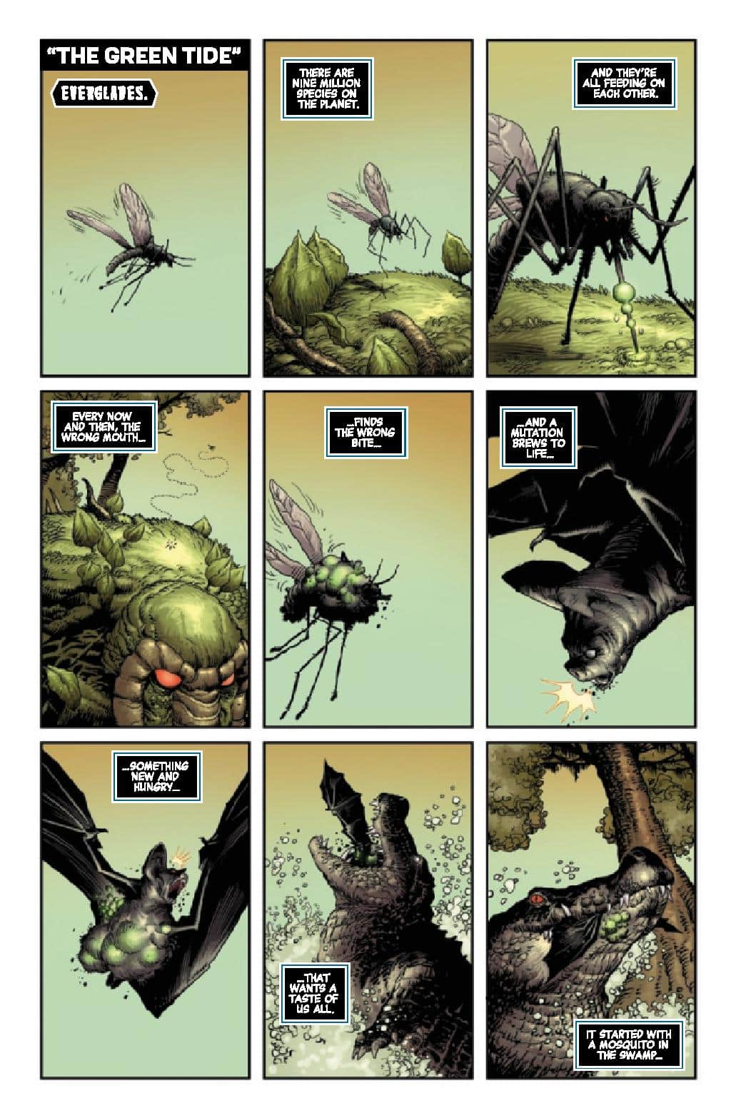 In “The Crypt Of Shadows”, a séance goes wrong, unearthing ghosts that come back for what they feel is theirs. In “Werewolf by Moon Knight”, Moon Knight gets in the middle of a brawl between two werewolves. In “Skin Crawl”, Morbius and Jinx take down a demon. In “Down Came The Rain”, Elsa Bloodstone and Johnny Storm traverse a underground tunnel to save Spider-Man. In “Endless Slaughter in the Infinite Swamp”, Man Thing and X-23 get stuck in a battle that lasts forever. In the last story “Neither Big Nor Bad”, our heroes gets caught up in an unknown and unseen evil.