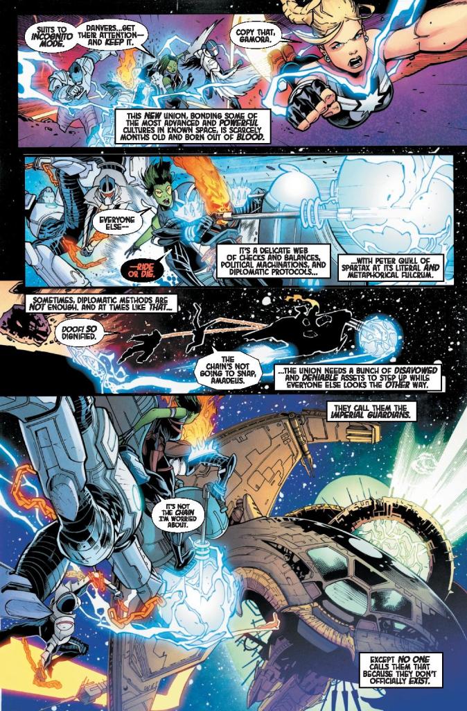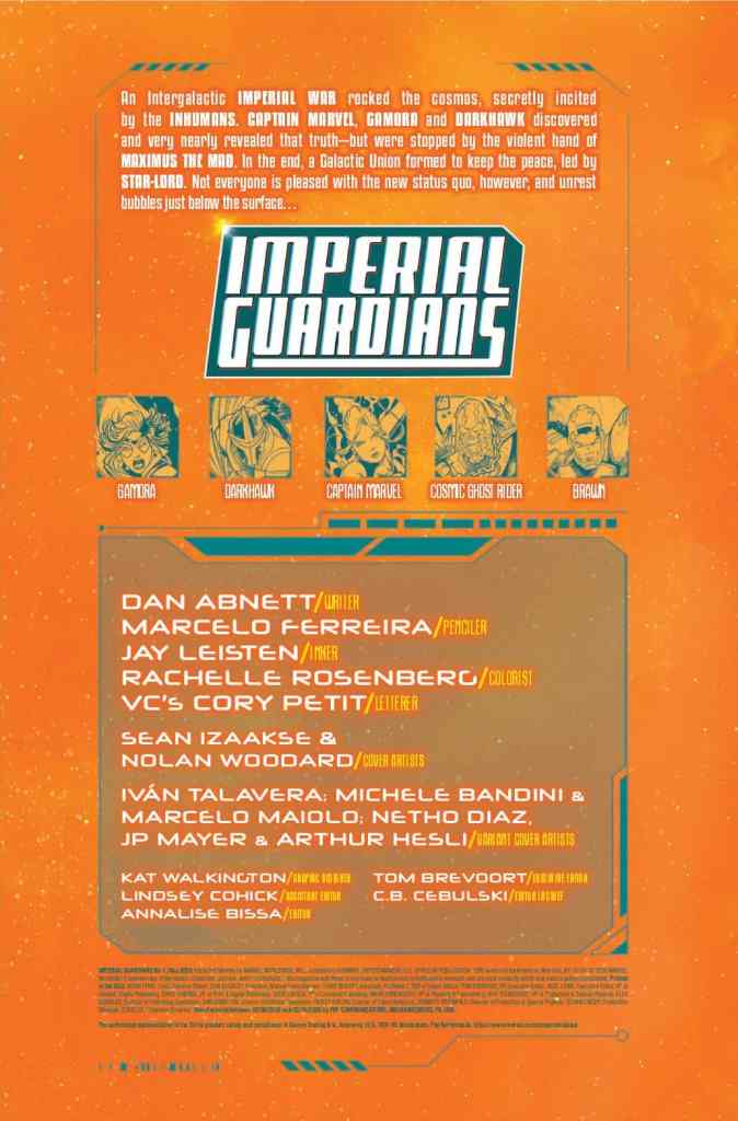 Gamora, Captain Marvel, Amadeus Cho, Darkhawk, Cosmic Ghost Rider! Five unlikely operatives recruited by Maximus of the Inhumans. Their mission? Protect the delicate balance of new Galactic Union by ANY means necessary…and failure is NOT an option. Expendable, deniable and disavowed, they are the Imperial Guardians. But can they do Maximus’ dirty work and keep their consciences clean? Why has a Kree Grand Admiral gone rogue and attacked Hala? What’s going on with Darkhawk’s mind? What deluded fool thought COSMIC GHOST RIDER was a team player? And, most importantly…what kind of game is Maximus REALLY playing? Imperial Guardians #1 doesn’t break any ground, but it does deliver an entertaining start.