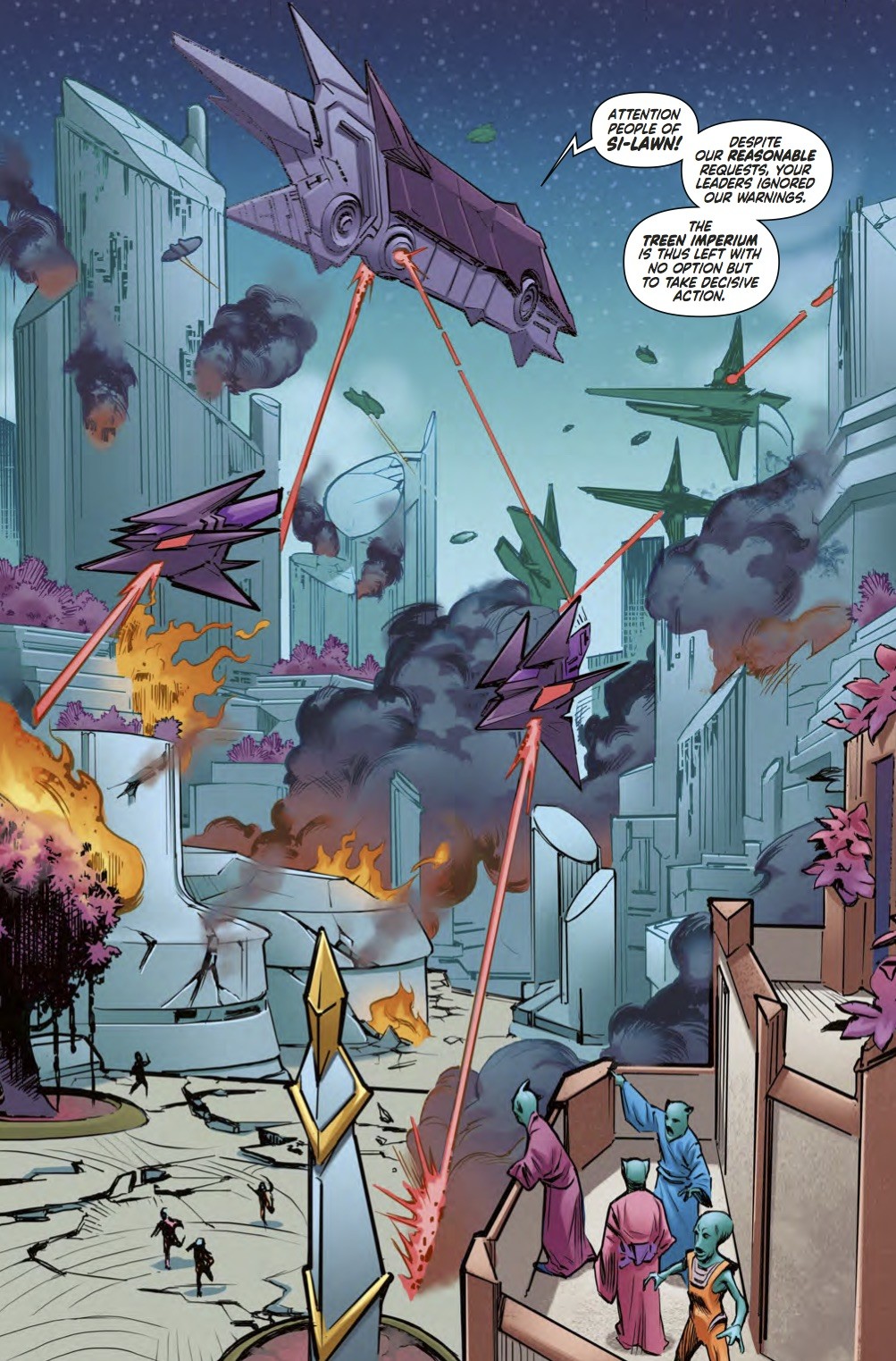 Adam Strange has to be the exposition spouting hero drawn in a clean pulp style by Evan Shaner, and this tension between him and Mr. Terrific’s investigation looks like the driving force behind the series. He has to be the hero and have the big redeeming moment while Dare is impotent, can barely walk, and his imagery is used to uphold a government that is okay with turning “undesirable” humans into food called Manna in cahoots with the Treen leader, Mekon, that Dare fought so many years ago. For now, King seems content with self-involvement via superheroes instead of looking at larger systems of control like Grant Morrison and Rian Hughes did in Dare.