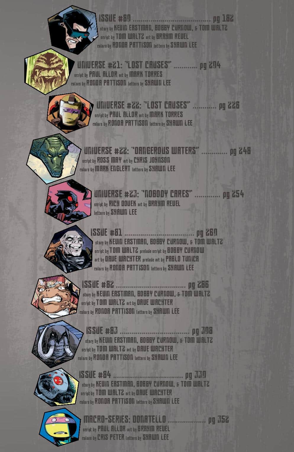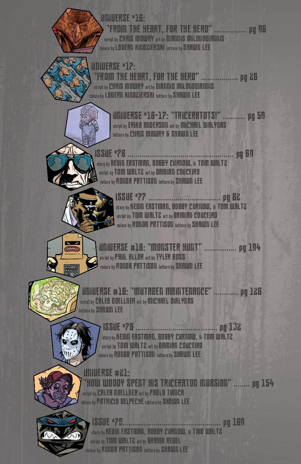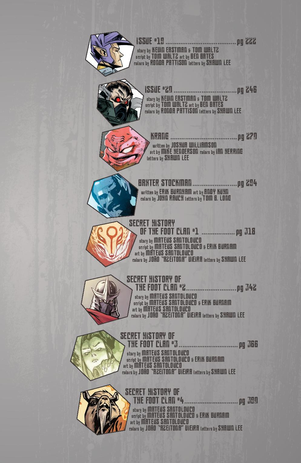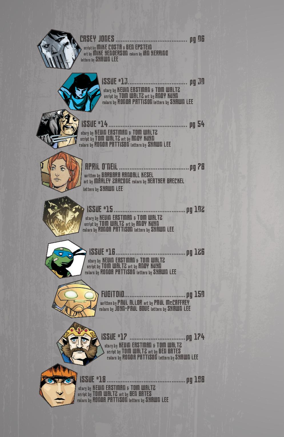 Art: Kevin Eastman, Jim Lawson, Paul Harmon, Frank Fosco, Chris Allan, Sarah Myer, Khary Randolph, Ciro Nieli, Andy Suriano, Michael Dialynas, Pablo Tunica, Freddie E. Williams II, David Petersen, Ken Mitchroney, Dan Duncan, Ronda Pattison, Sophie Campbell, Jodi Nishijima, Stan Sakai
