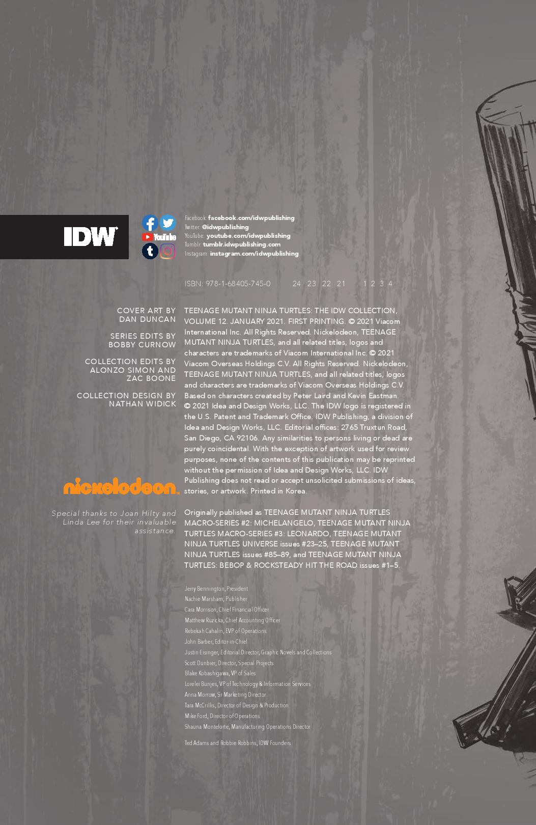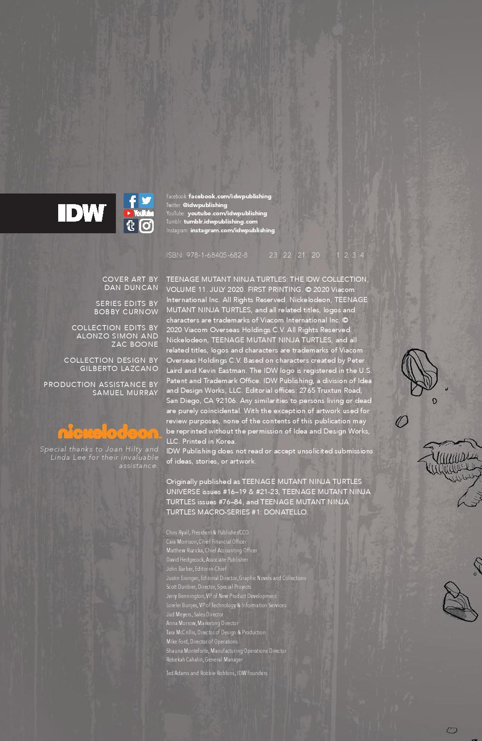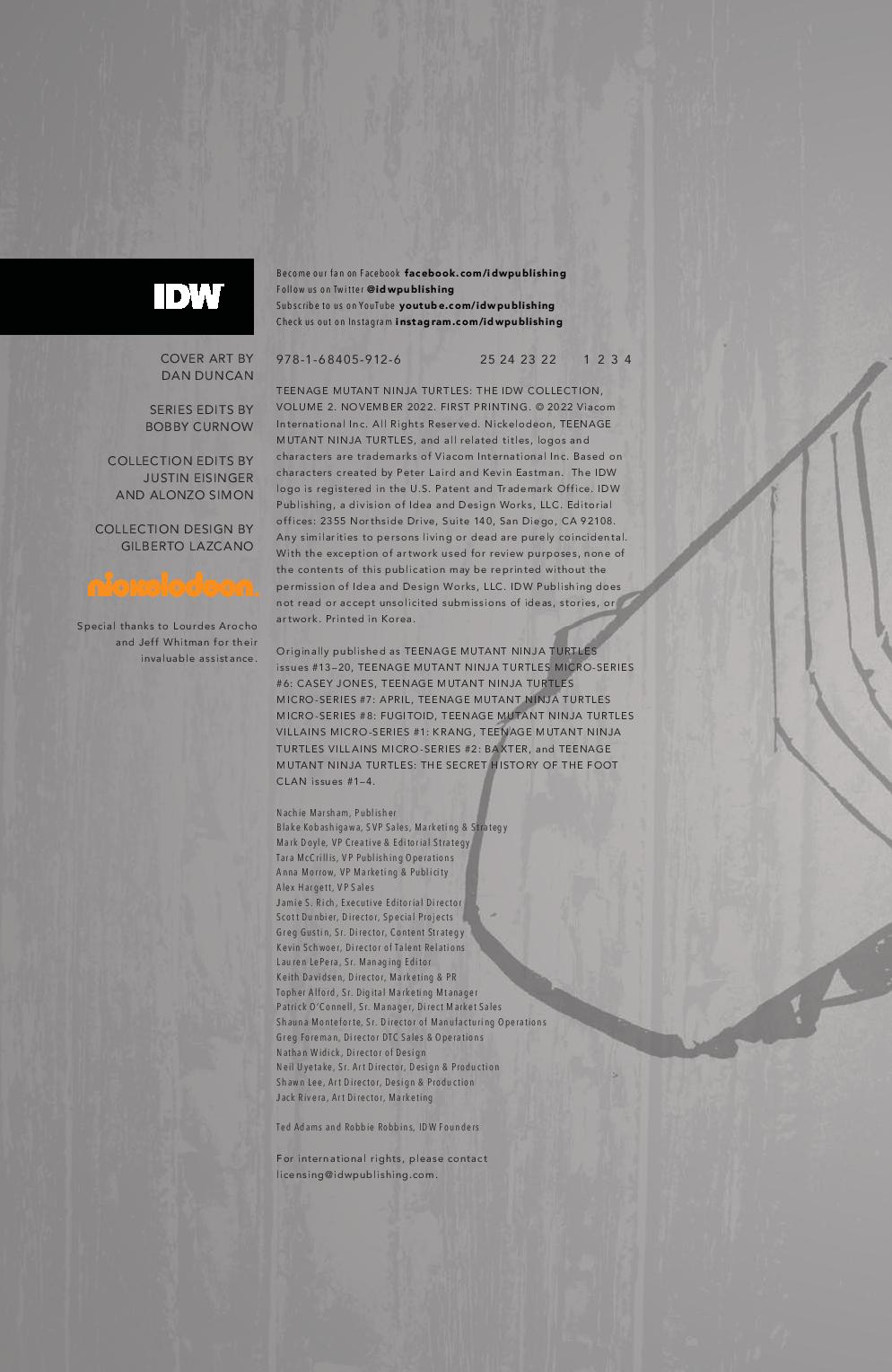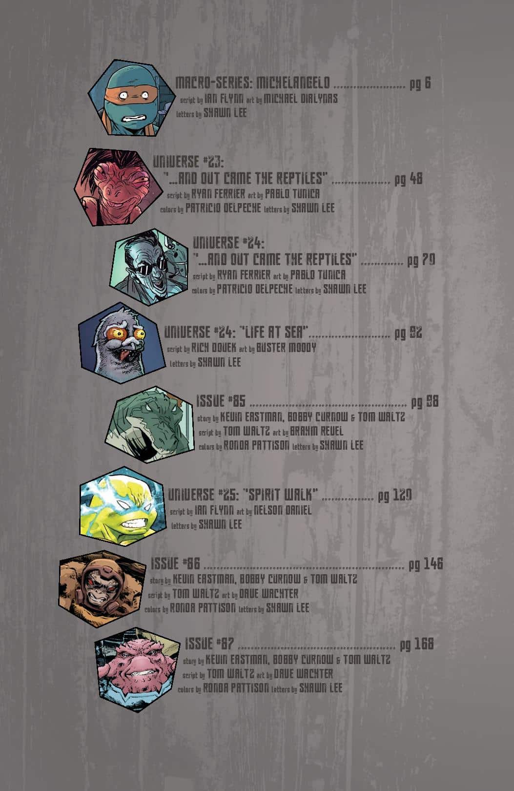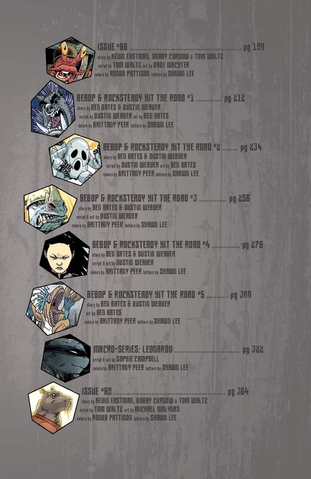 Art: Kevin Eastman, Jim Lawson, Paul Harmon, Frank Fosco, Chris Allan, Sarah Myer, Khary Randolph, Ciro Nieli, Andy Suriano, Michael Dialynas, Pablo Tunica, Freddie E. Williams II, David Petersen, Ken Mitchroney, Dan Duncan, Ronda Pattison, Sophie Campbell, Jodi Nishijima, Stan Sakai