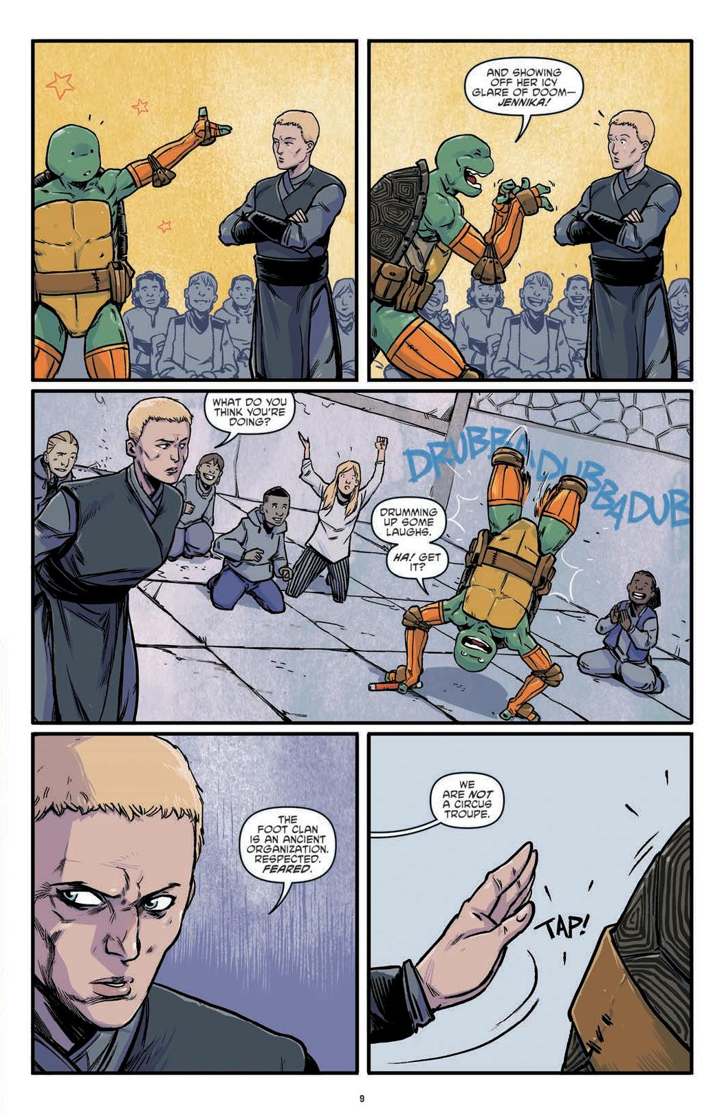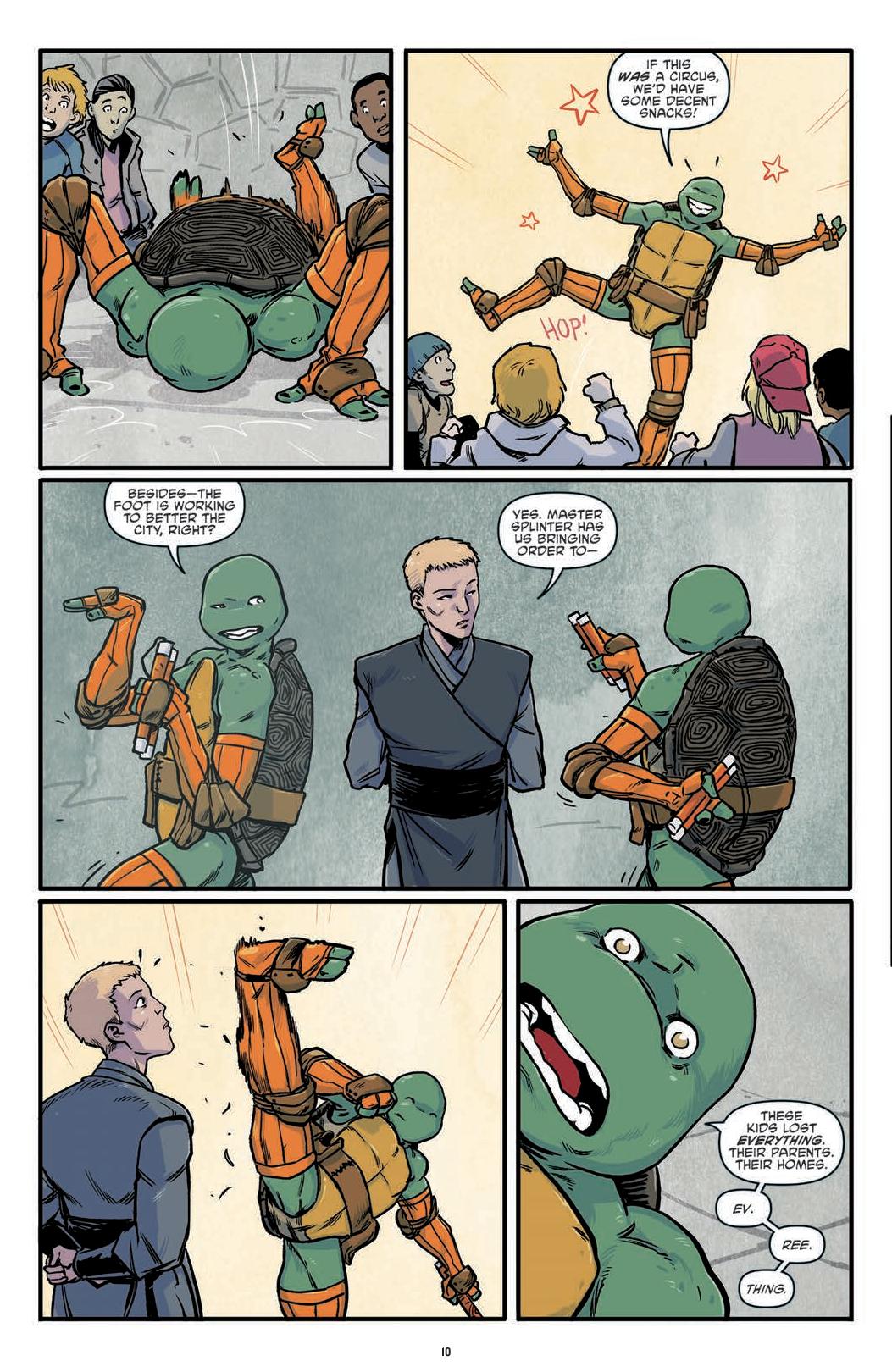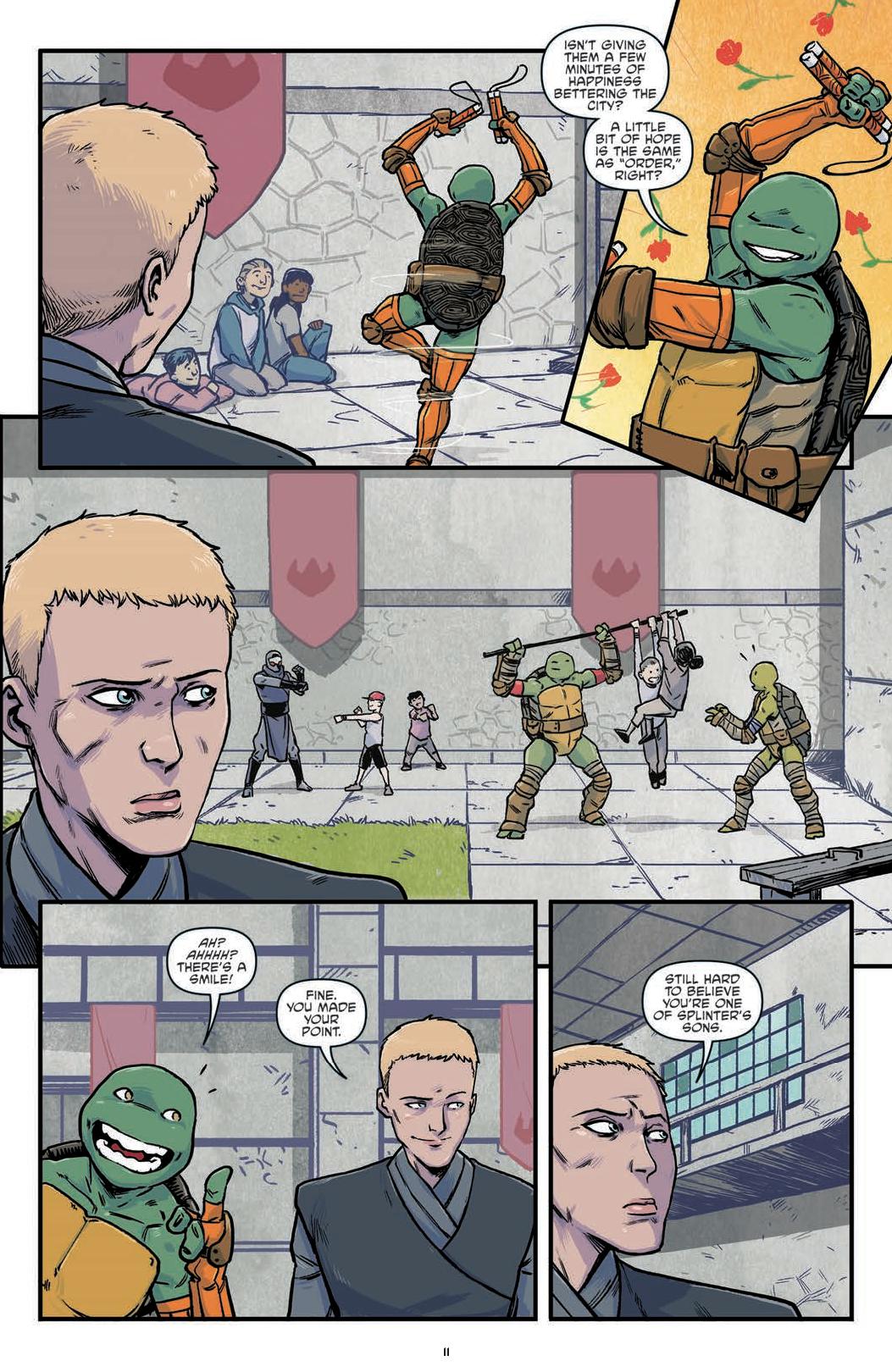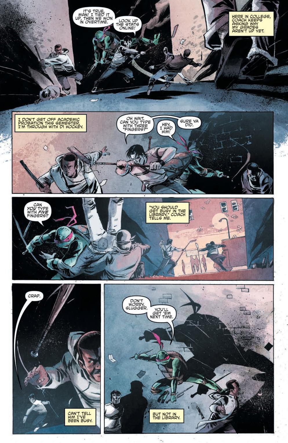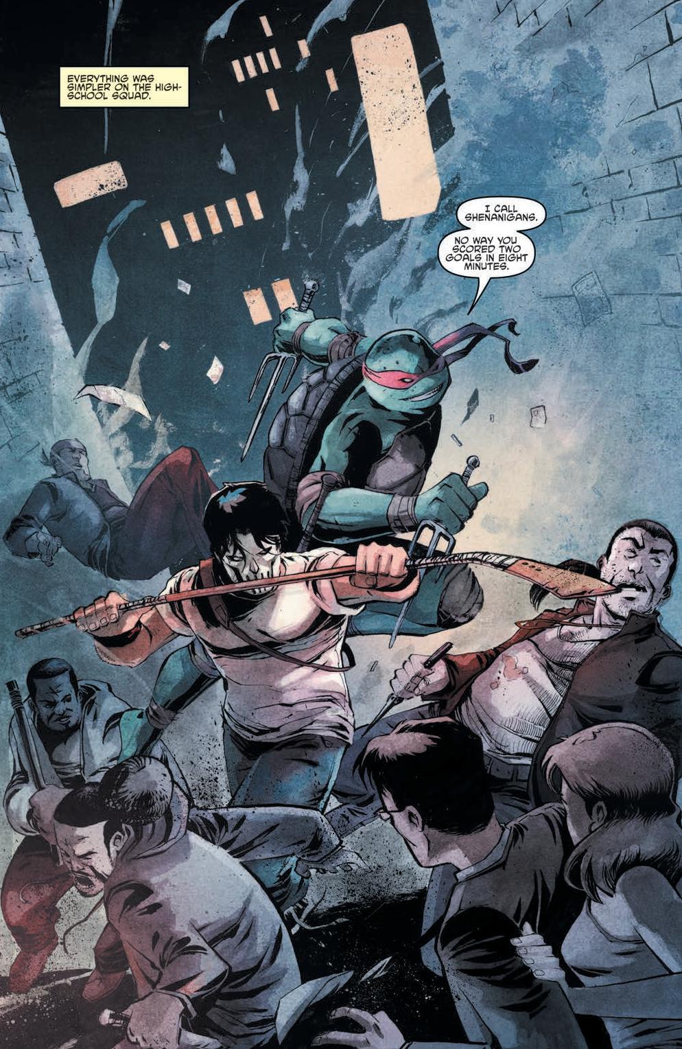 In “Mirage 1 Story,” we look at Raphael’s life as the Last Ronin through the words of Edgar Allen Poe. In “Monsters,” one boy is left traumatized by an encounter with a thug and one of the boys. In “Gang Wars,” one reporter reflects on the different news stories she has heard in 20 years about the Turtles, their friends and their enemies. In “Downtime,” the boys patrol the sewers and reflect on how much they have changed. In “Man Behind The Mask,” Raphael and April meet Casey Jones for the first time. In “What about Tomorrow,” the boys question their future. In “Splinter Forever,” Splinter reflects on his life while trapped by Shredder, only to free him and reaffirming his life choices. In “Kraang Among Us,” the boys have a dance off with a local dance crew who turns out to be Kraang Primordius. In “Farewell,” we are taken 20 years into the future, where the boys try to finagle with time travel. ”Father’s Day” sees Michaelangelo with is son visiting Splinter at his grave. In the final story ”Teen Spirit,” the boys are taken to a place between worlds called the Thin Place, where reality and dreams become entangled and the boys’ mettle get tested.