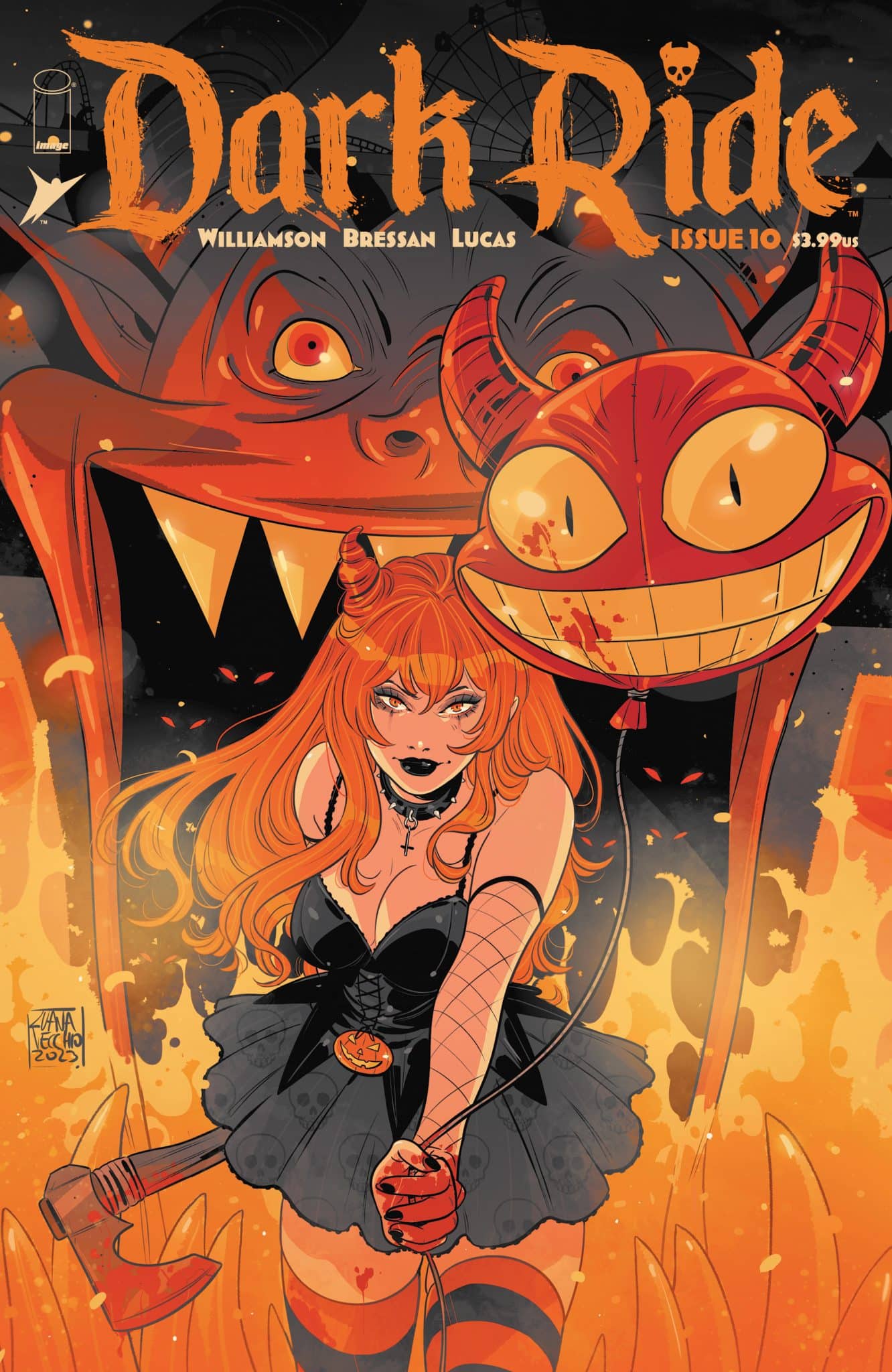 Dark Ride #12 concludes the impressive variant cover lineup that has run throughout the series. In addition to the main cover by Andrei Bressan and series colorist Adriano Lucas, Dark Ride’s Cover B variant features a frightening collage of Halloween and Danny D. Evil with an issue #12 cover by Caspar Wijngaard, while Cover C spotlights Devil Land’s femme fatale and horror aficionado, Halloween, by Luana Vecchio.