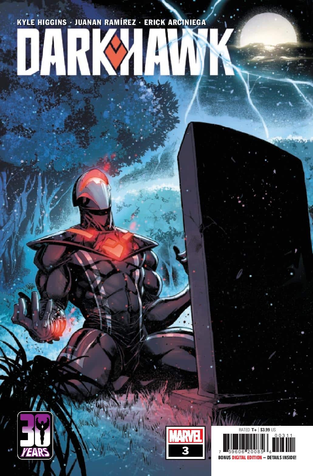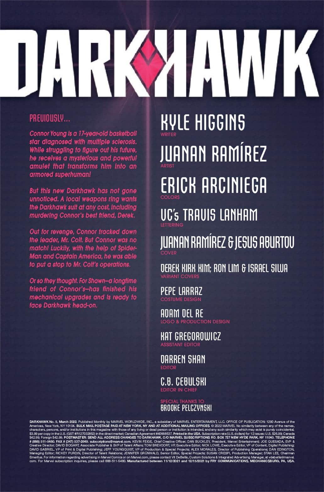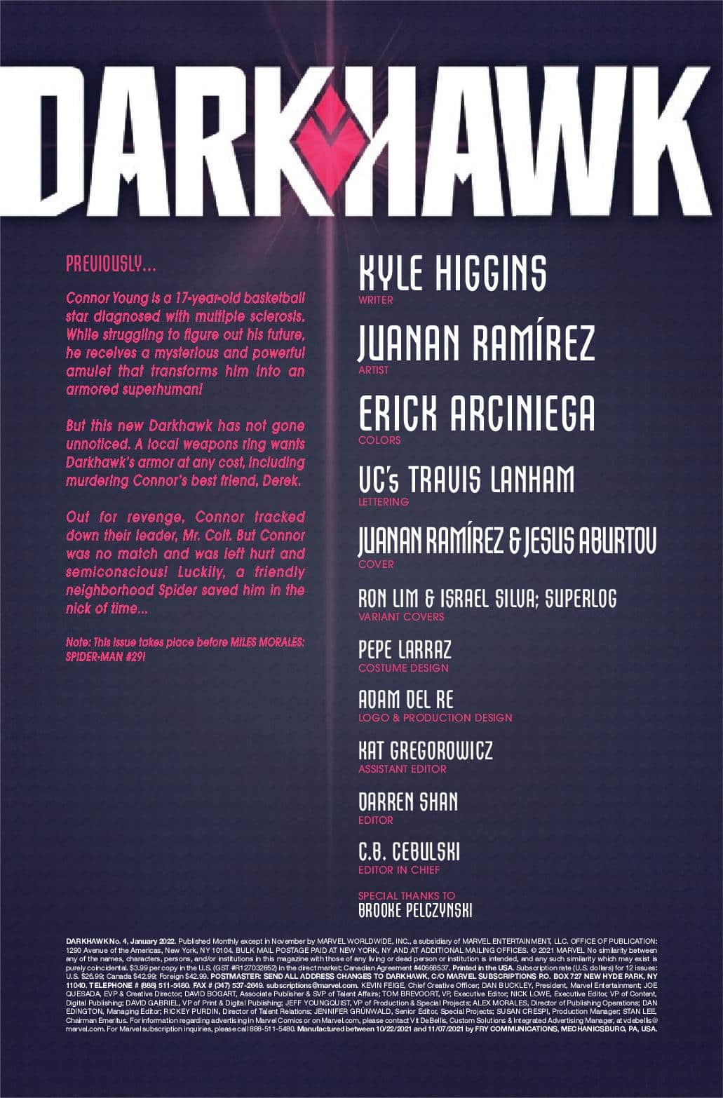 Kyle Higgins and Juanan Ramírez start a new era of an all-new Darkhawk in Darkhawk #1. Connor Young is a seventeen-year-old star basketball player with the world ahead of him, until a surprising medical diagnosis changes everything. But what happens when a mysterious amulet finds him and gives him powers beyond belief? What will he do with these new abilities?