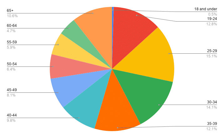 When it comes to percentages, the age groupings shifted very little. There’s some slight changes in tenths of a percent but no wild swings. Almost all groups decreased, “19-24” remained the same, and “18 and under” increased slightly.