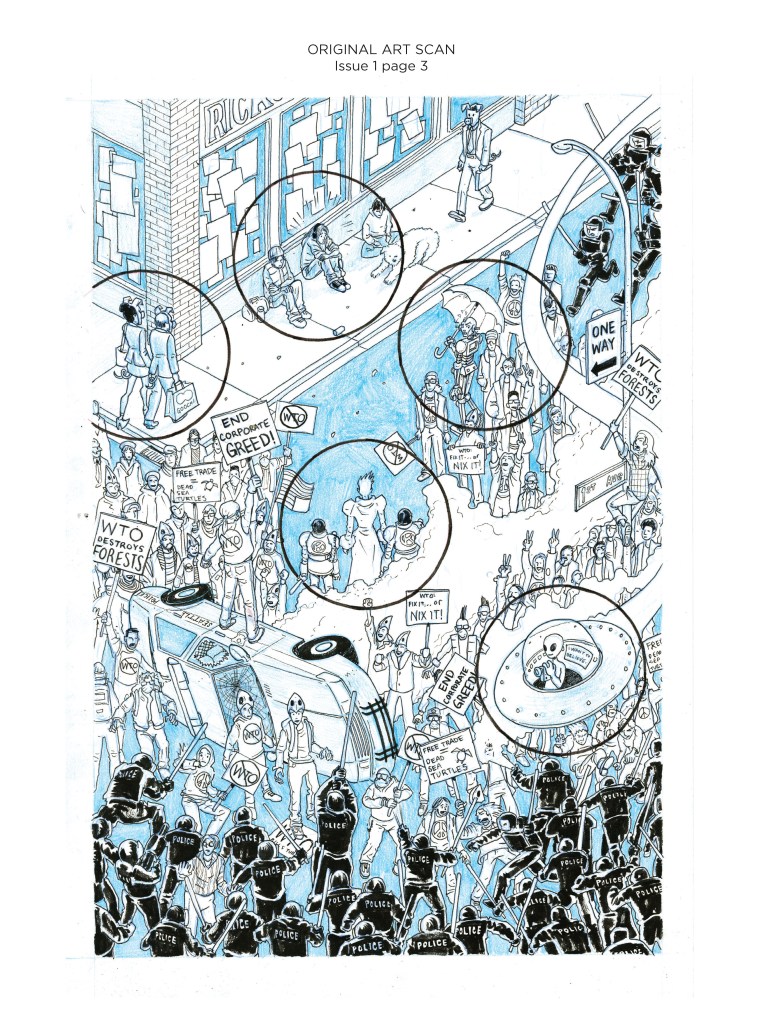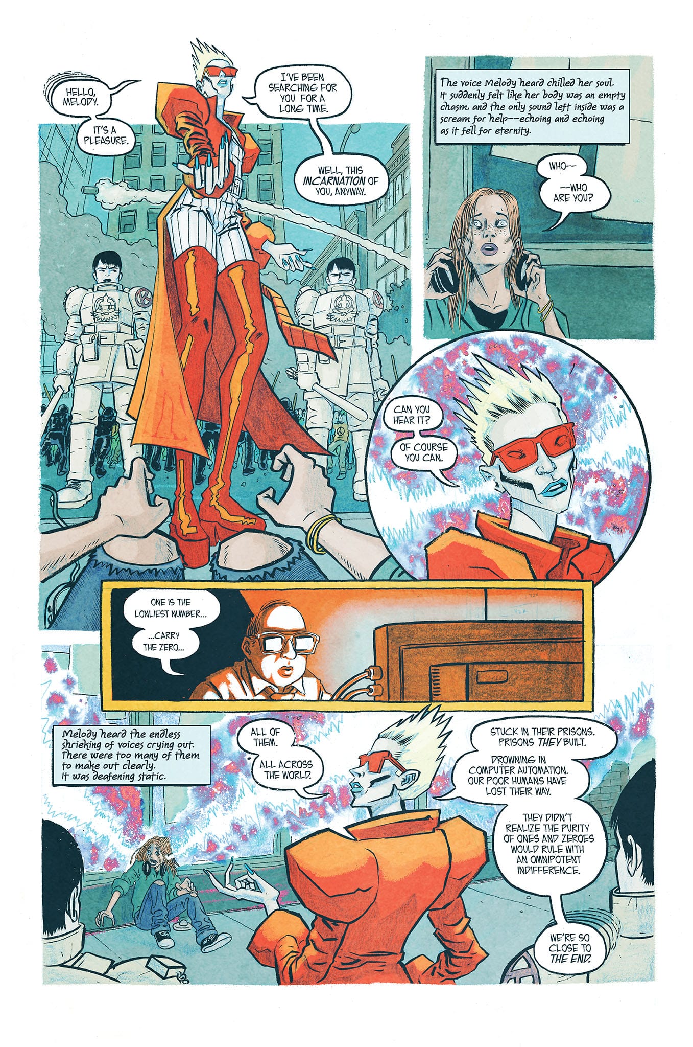 Melody Parker is losing her mind. She’s living on the streets of Seattle during the WTO protests of 1999. She is seeing things. Androids. Aliens. Pigs in high fashion. And a creature named Echo—one of the Sustained: elemental beings with the power to alter reality through music. She invites Melody to join her as she brings about the end of the world. As Melody tries to escape this strange woman, suppressed memories from across vast spans of time flood into her awareness, bringing her very identity into question. You don’t want to miss this stunning new release from writer Rick Quinn and music-comic-specialist Dave Chisholm (Miles Davis & the Search for the Sound)