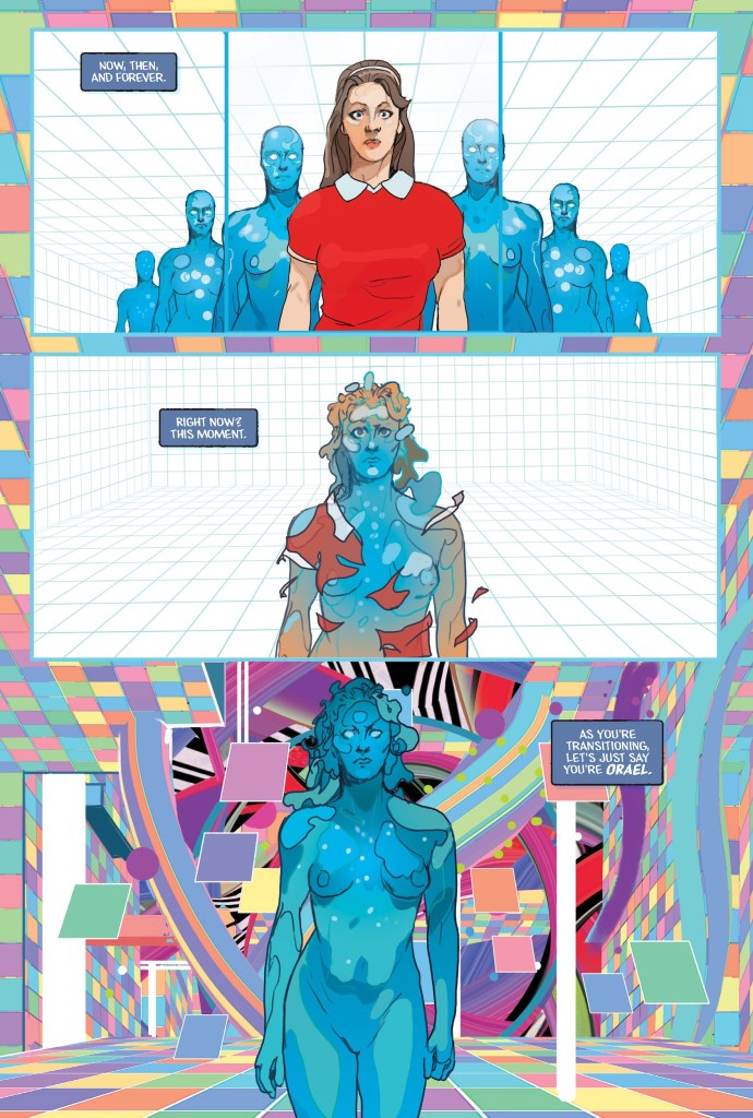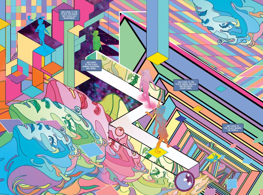 WELCOME, TRAVELER. YOU ARE ABOUT TO PASS THROUGH THE FINAL GATEWAY … AND ALL WILL BE REVEALED! Oni Press and SpectreVision, the genre-distorting production company founded by Elijah Wood and Daniel Noah are proud to present your first look inside High Strangeness: Book Five! Everything we have witnessed thus far – from sightings of Men in Black in 1967 through to psychic test subjects tasked with unlocking alien secrets in 2001 and more perplexing phenomena – has led to this point … and now series creator Daniel Noah is joined by multiple Eisner Award winner Christian Ward to finally reveal the unspoken truth that connects each episode of High Strangeness across time, space and a hierarchy of confounding new dimension beyond all human understanding.