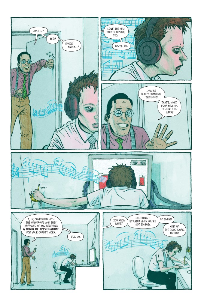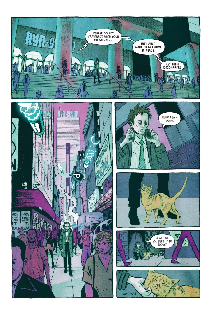 Ted, isolated and paranoid, works for a mega-corporation owned by the world’s only trillionaire. He suffers from night terrors, obsessively draws the same mysterious figures again and again, all while listening to one track of music on repeat–oh, and the only “person” he ever talks to is a stray cat. His humanity is hanging by a thread.