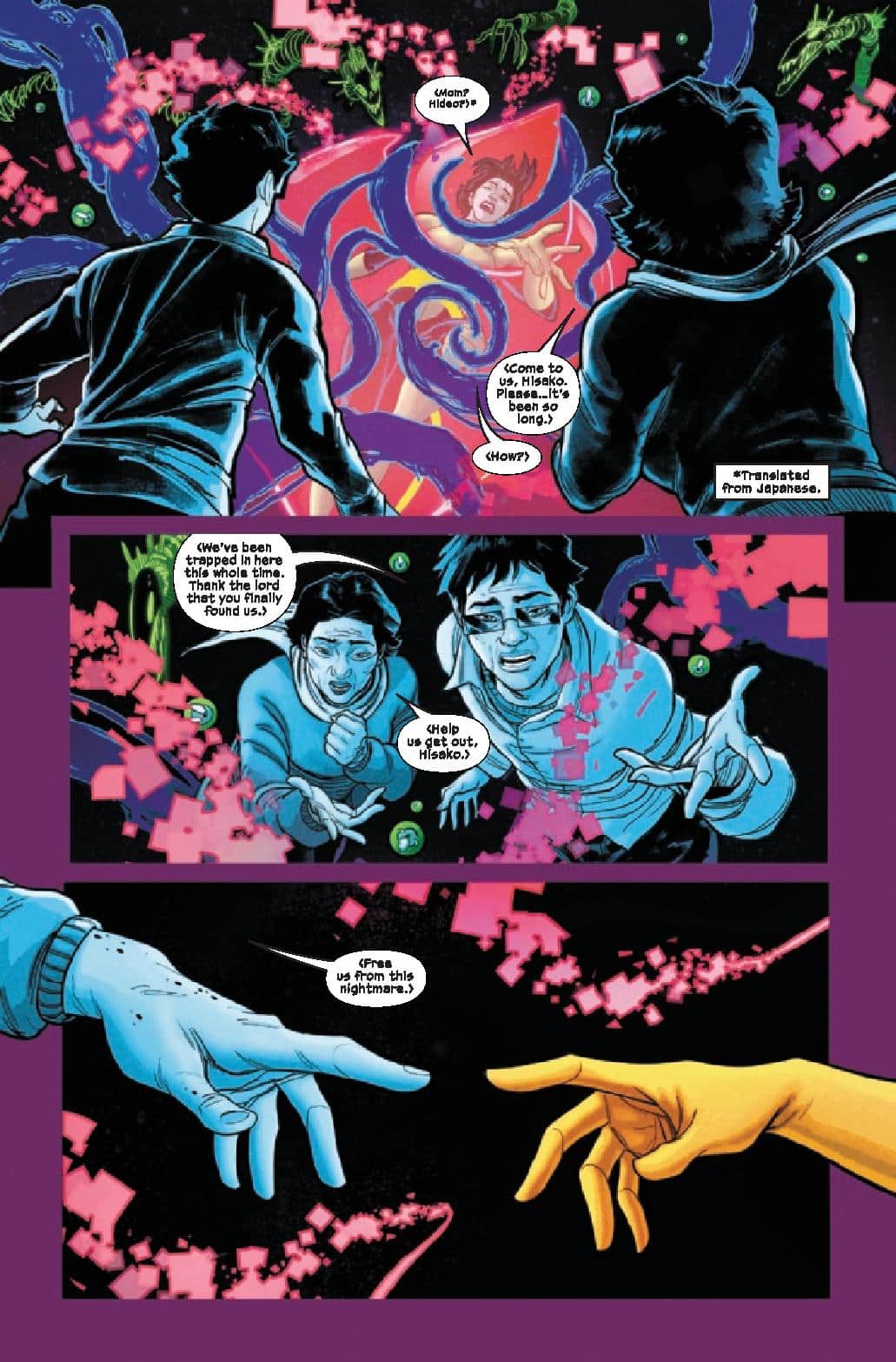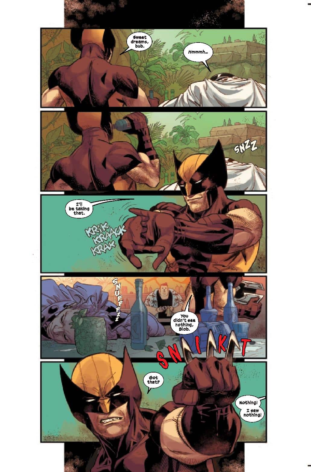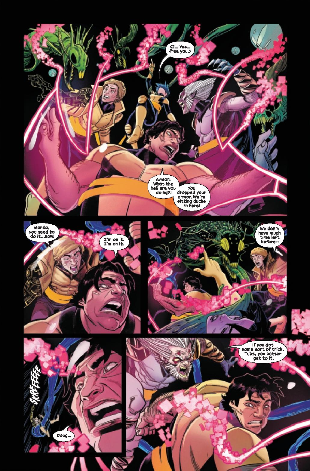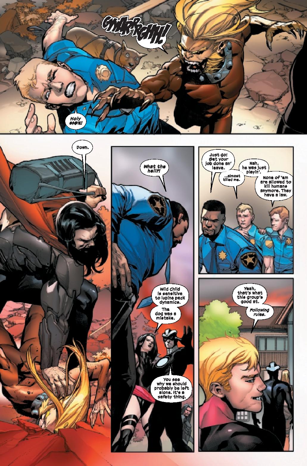 What’s fascinating, and fantastic, about Hellions #2 is Wells ability to blend together so many different tones and aspects. There’s horror, comedy, social commentary, and of course action. Things go sideways on the mission from the initial meeting with local law enforcement to the horror awaiting the team within the orphanage. Wells nails the horror tone as the team meets their adversaries and we get even more information as to Mr. Sinister’s clone program’s past. The comic would have been top-notch just focused on the action with a horror spin but Wells adds in humor to it as well. This is a team of misfits and the inclusion of Orphan-Maker and Nanny deliver a one-two punch of laughs that are unexpected in two sequences, one extended to that perfect punchline.