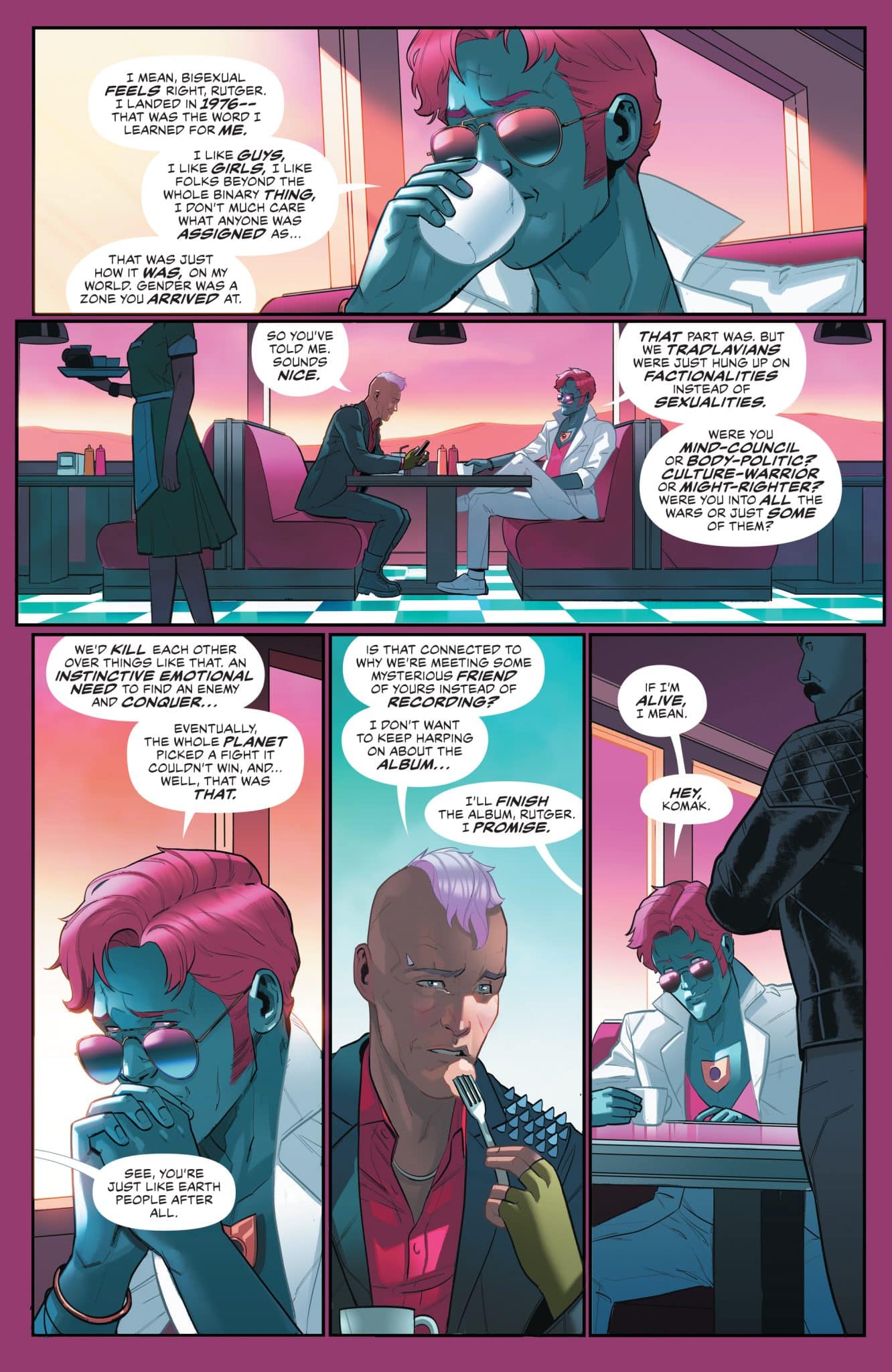 DC’s Eisner and Ringo award-winning Pride anthology returns in the form of a universe-spanning travelogue like you’ve never seen! In its pages, Dreamer makes a first-time pilgrimage to her ancestral planet, Naltor! Poison Ivy and Janet from HR go spore-hunting on Portworld! Superman (Jon Kent) gets the boys together for a night out in A-Town, but things go sideways when The Ray vanishes into thin air! Steel (Natasha Irons) works up the courage to face Traci 13 at the Oblivion Bar’s Pride party for the first time since they broke up! Aquaman (Jackson Hyde) catches an unexpected ride to the Fourth World just in time for their annual Love Festival! All this and more in a volume celebrating how the LGBTQIA+ community is everywhere and belongs anywhere–even the very furthest reaches of the universe. Plus, this year’s anthology features a special preview of the upcoming YA OGN The Strange Case of Harleen and Harley, as well as an unmissable autobiographical story written by industry legend Phil Jimenez about the fantastical worlds that shaped him, brought to life by Giulio Macaione!