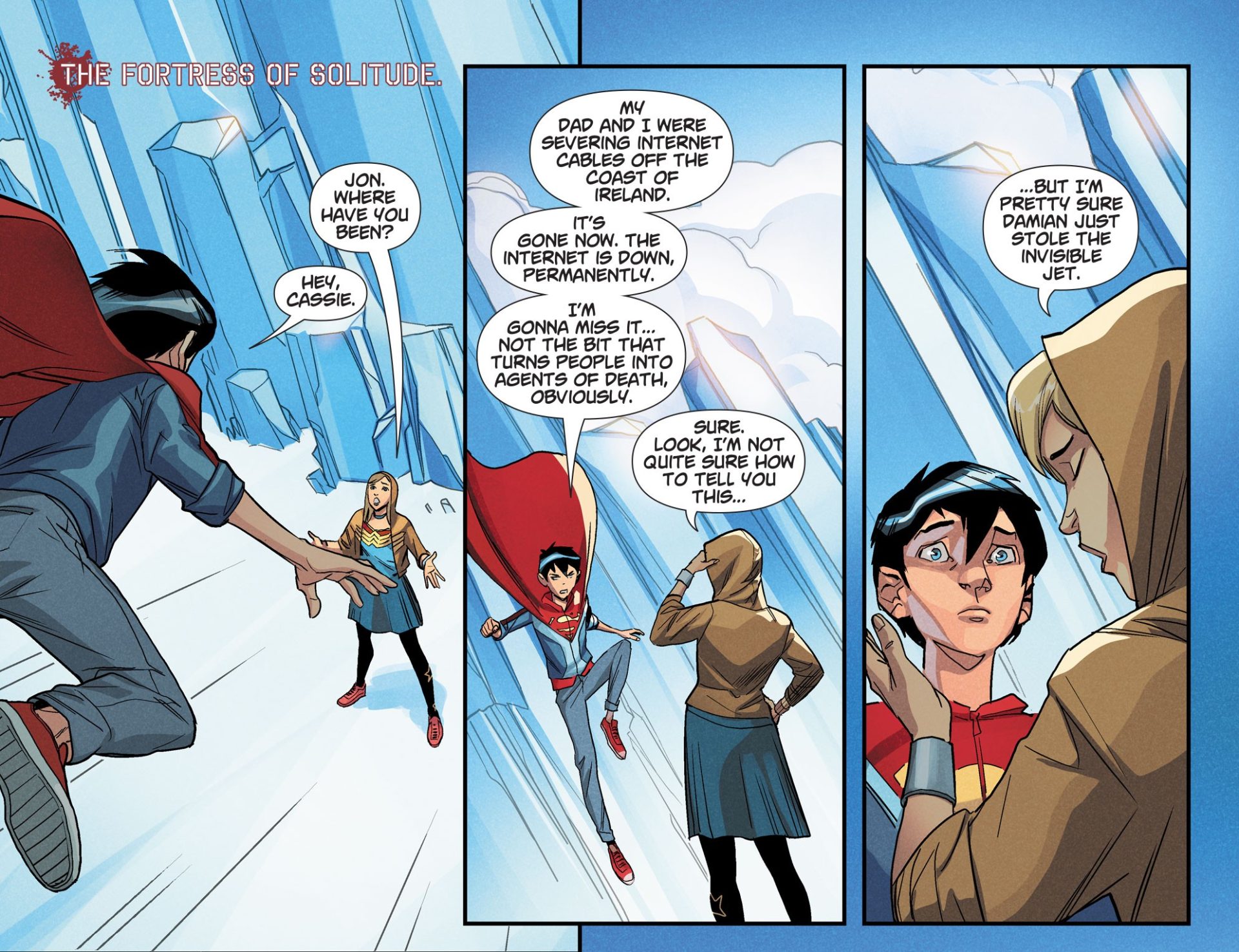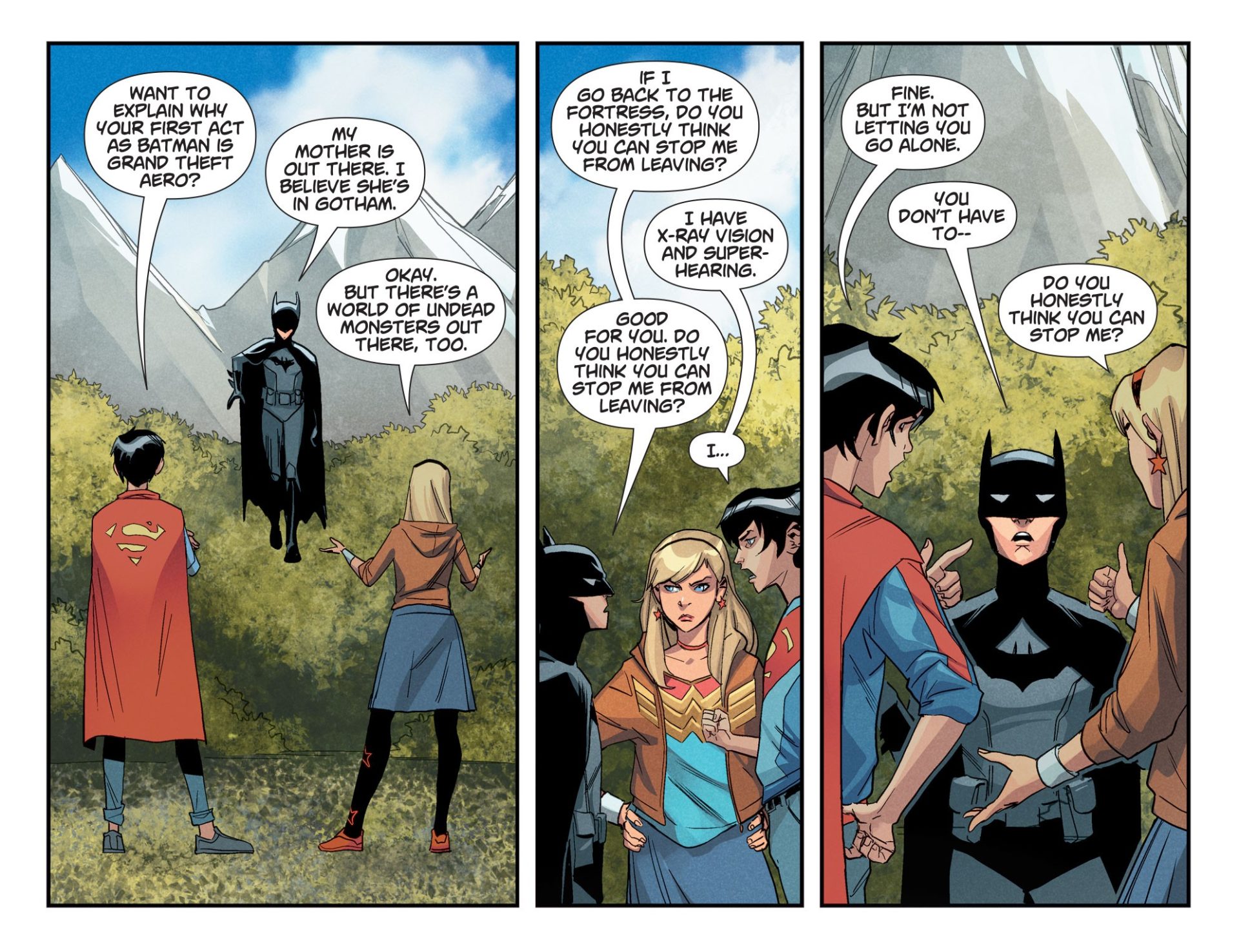 Writer Tom Taylor shakes things up again with an issue that stands on its own pretty well. Damian is on his first mission as Batman, to find his mother. Joining him are Jonathan and Cassie, the future Superman and Wonder Woman. And in this issue we see the bond of the trio. The interactions are great and it feels like kids supporting each other as best they can.