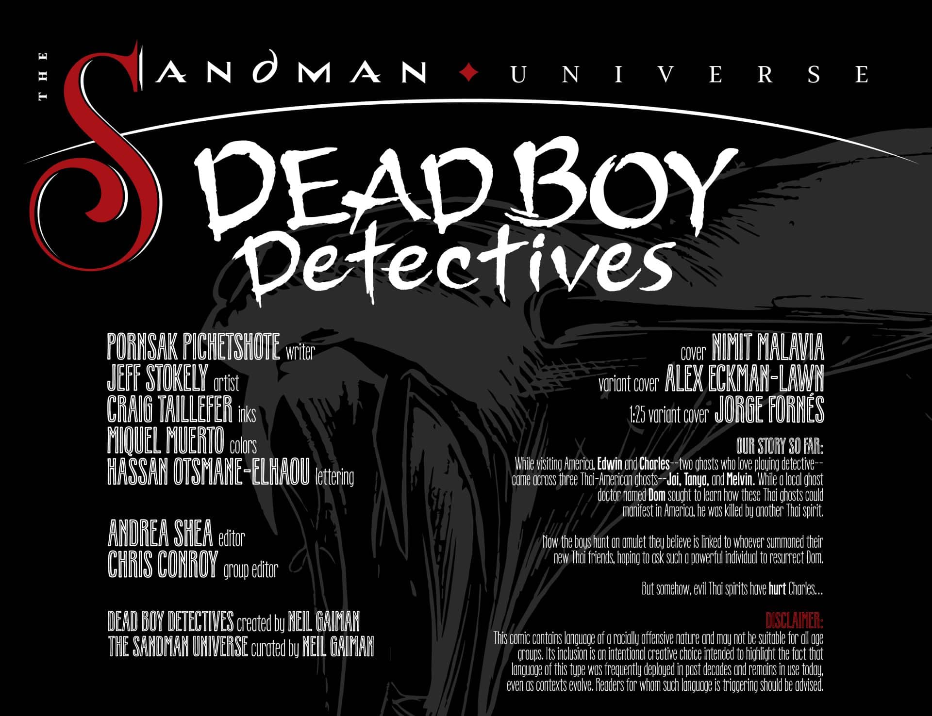 As Charles begins to weaken and mutate from his terrifyingly permanent and possibly mortal wounds, Edwin and the other ghost kids chase down every possible lead to save him—but only find dead ends. Jai takes the reins in the midst of her friends’ despair, but she’ll soon discover the Dead Boy Detectives aren’t the only dishes on the krasue’s menu…