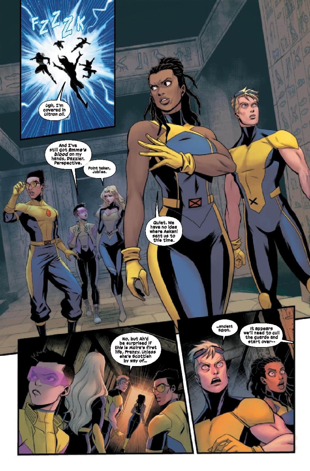 Written by Steve Foxe, Dead X-Men #1 features the team of Frenzy, Prodigy, Jubilee, Dazzler, Cannonball, and Askani. The team make-up catches the attention, it’s an odd one we haven’t really seen before. That opens up a lot of potential as how the X-Men teams gel together is part of the fun. We get a little bit of that here but the main focus of the comic is the mission. Towards the end of Rise of the Powers of X, Professor X hinted at his plan to attempt to right the nightmare timeline that has been spun. It seems that Dead X-Men will focus on that mission.