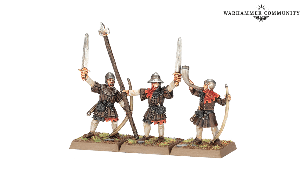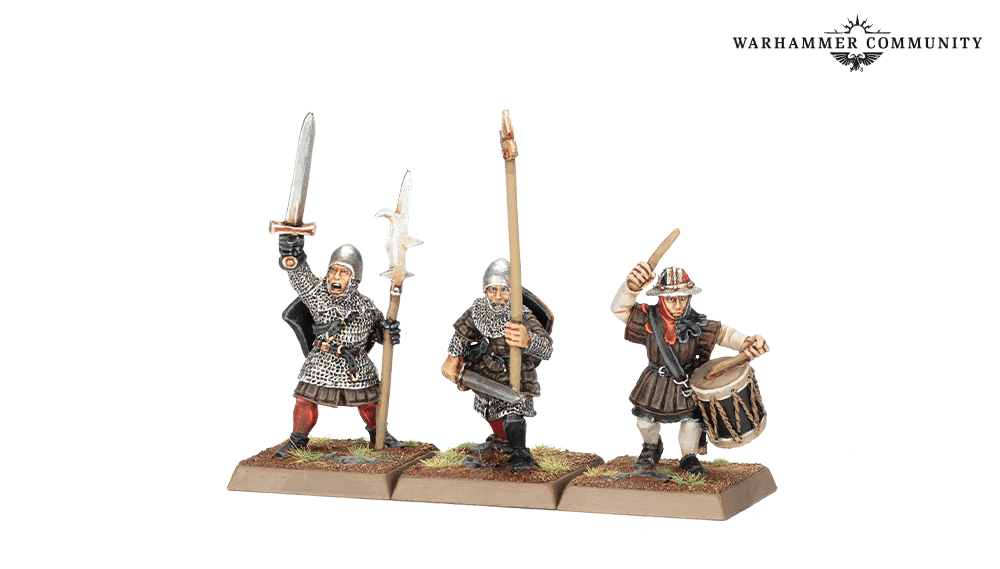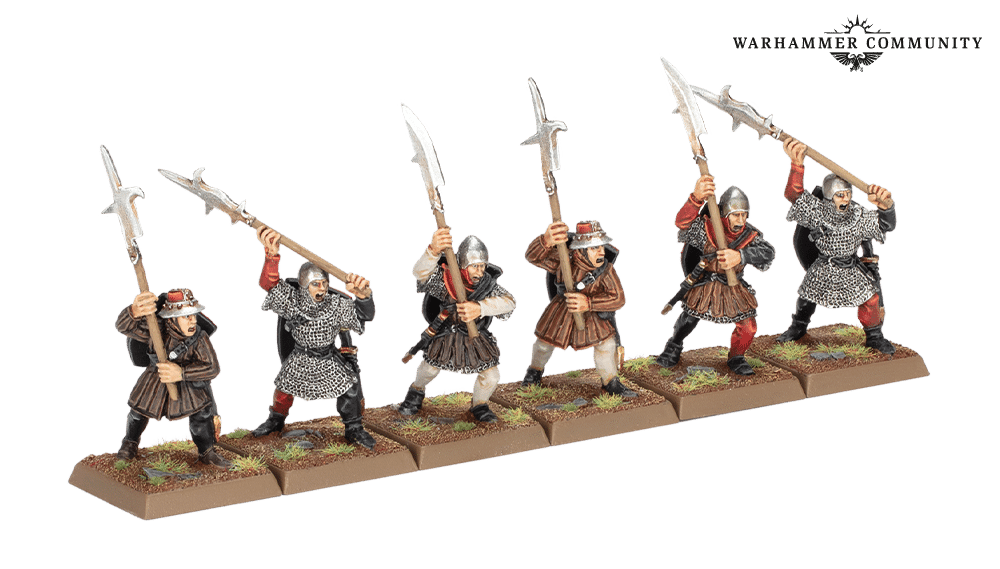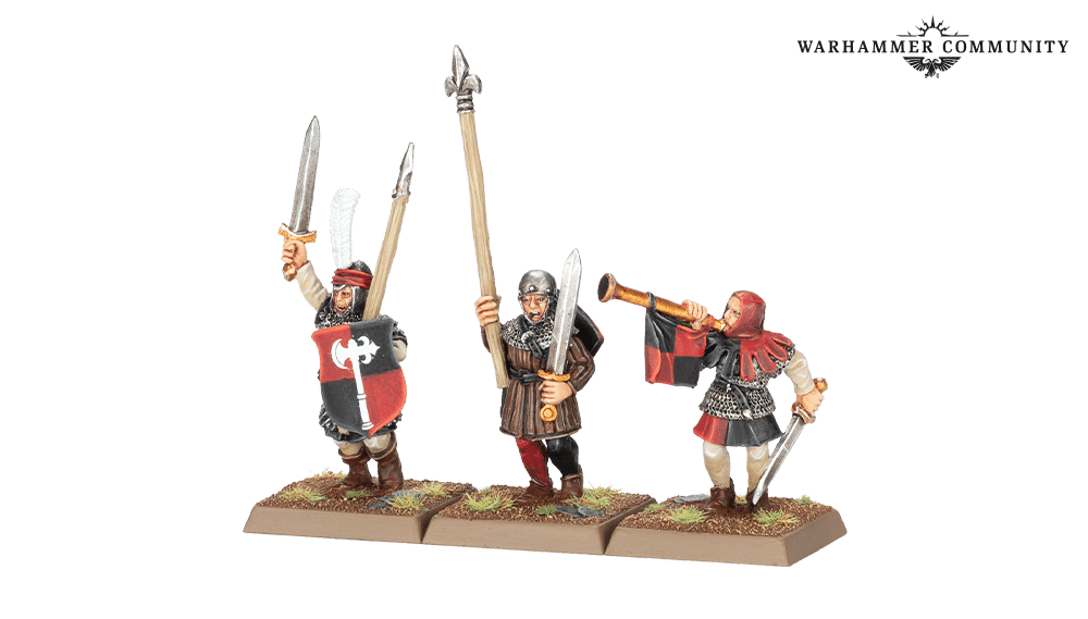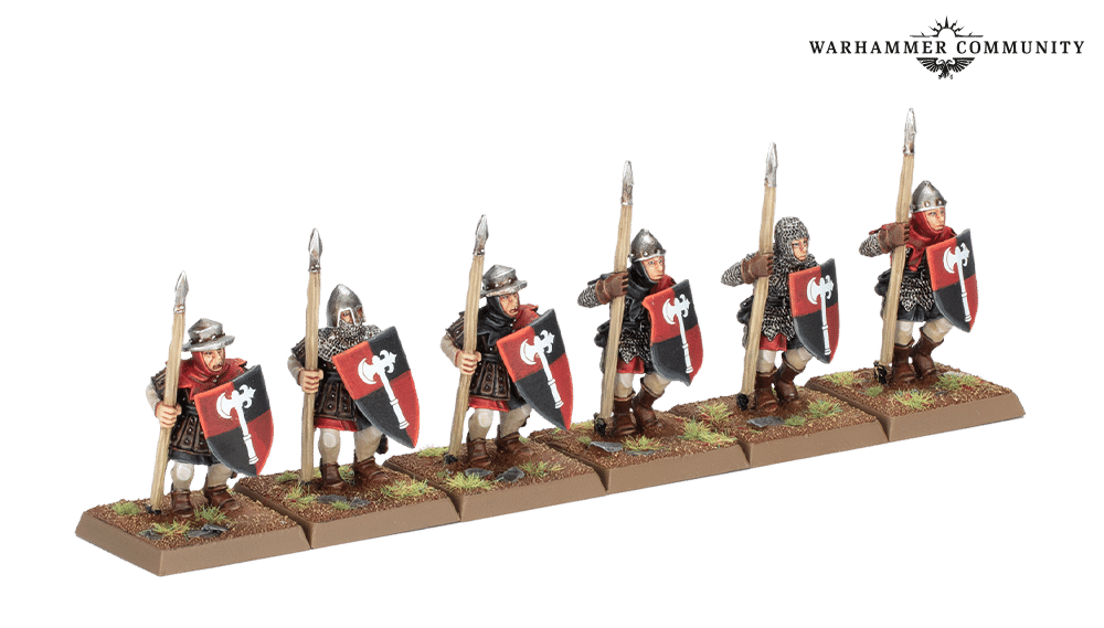 Six Peasant Bowmen are joined by 3 Peasant Bowmen Command, while six Men-at-Arms with Spears are led by three Men-at-Arms with Spears Command. There are also 6 Men-at-Arms with Halberds (you get two each of the three miniatures) and 3 Men-at-Arms with Halberds Command. The Command Groups come with six paper banners, while all Men-at-Arms arrive with one or two positively ancient fighter shield sprues.