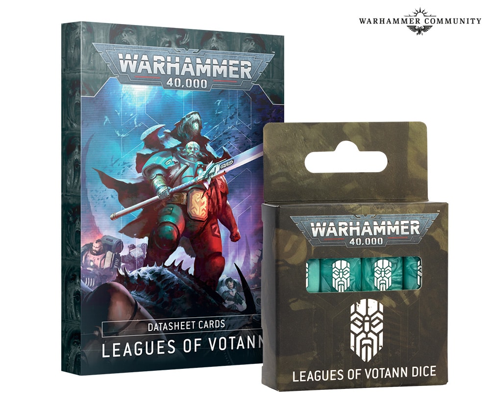 Keep track of things and show off your loyalty with the Leagues of Votann Dice and Datacards. It’s a set of 16 sea-green dice with the faction icon on the six face, and a pack of 26 quick-reference datacards comprising every datasheet in the faction (including for Combat Patrol) and the army rule.