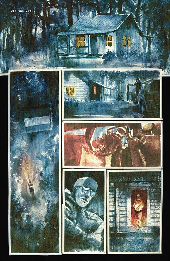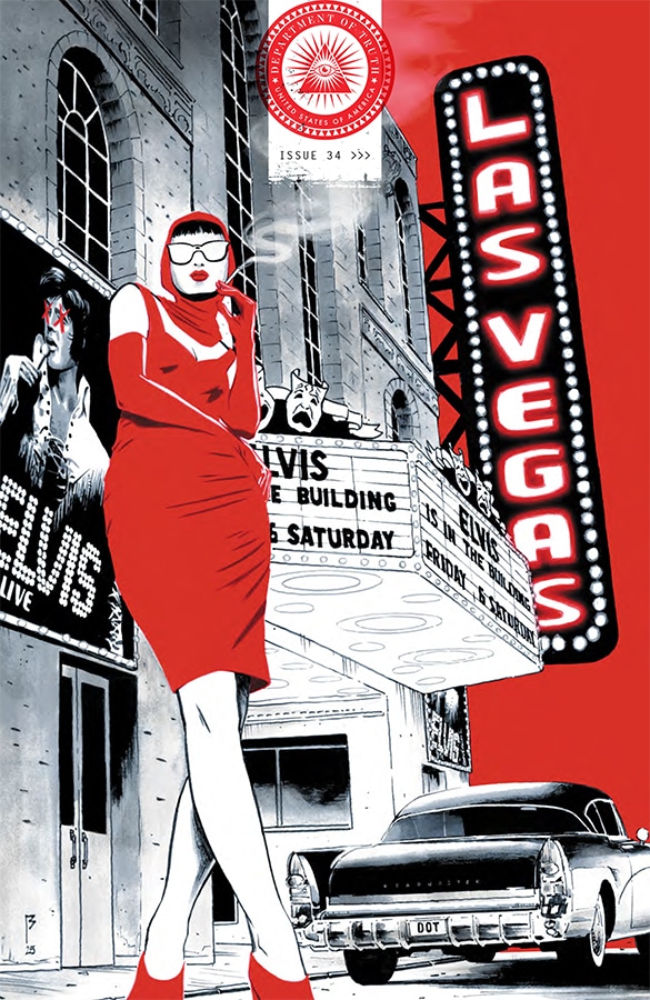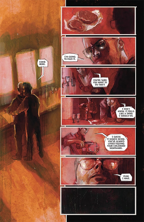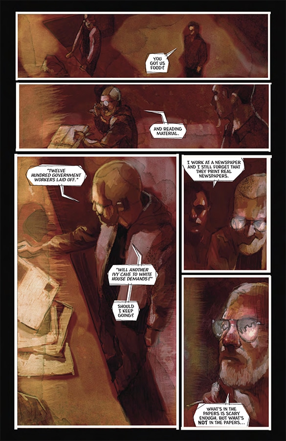 You can tell he doesn’t have a high opinion of most of these characters, and it drives his line art and color palette to new heights like a blood red composition of a couple of rich, conspiracy-mongering assholes through Cole’s shades. Everything is more memorable from the perspective of sunglasses, and that goes for both film and comics. Martin Simmonds’ layout choices match the story’s pace with lots of small, skinny panels during interrogation sequences to big splashes for reveals or when he and Tynion want to touch on a big picture theme. I enjoyed Martin Simmonds’ work on the Punks Not Dead comics for IDW as well as his fill-in issue of Immortal Hulk, but Department of Truth is a true level up for him as a cartoonist with him crossing into Sienkiewicz-esque territory with his depiction of corruption, deceit, and maybe once or twice, truth.