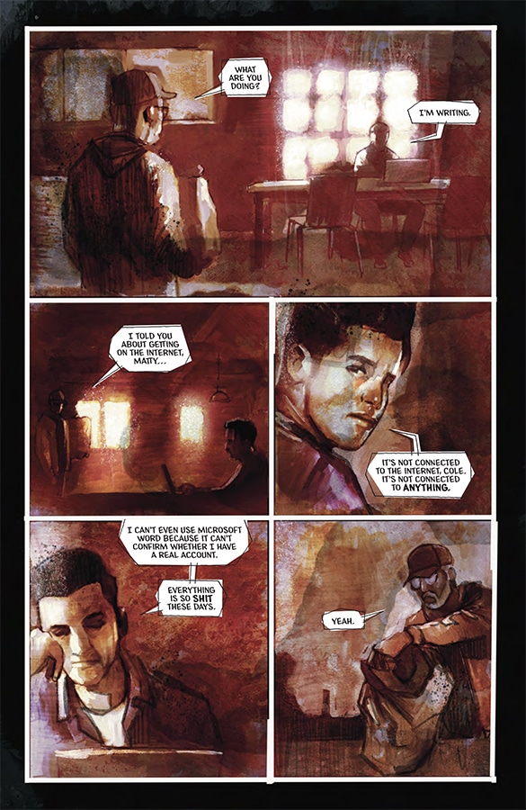 A key reason that I enjoyed The Department of Truth #1 was Martin Simmonds’ art. He marries grid layouts with the fully painted art style of Duncan Fegredo and Paul Johnson’s work in the early 1990s or even the panache of David Mack and Bill Sienkiewicz. However, it’s not just pretty pictures or cool compositions but has motion and storytelling weight too. Simmonds can also be a vicious caricaturist, like in his drawing of the Flat Earth Society members that match the dry, snarky narration that Tynion writes for the protagonist, Cole.