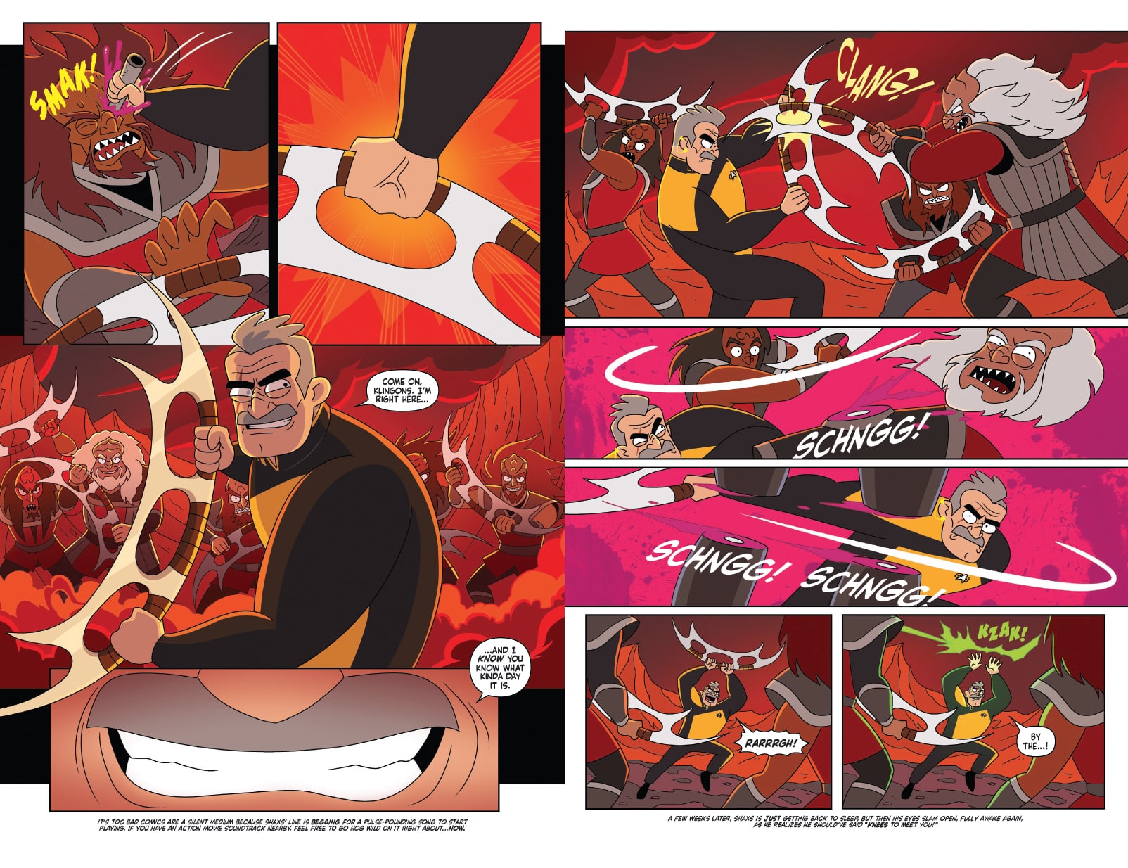 Then, Shaxs had his best day, but now that the universe has been rewritten by the mad android Lore, he’s about to have his worst. Starfleet has been distorted into a machine of oppression antithetical to everything it once stood for, and Shaxs has been made into the one thing he despises most in the universe: a fascist. Once he’s free of Lore’s hold over his mind, it will be up to Shaxs to revert everyone in Starfleet back to their old selves and save the cosmos.