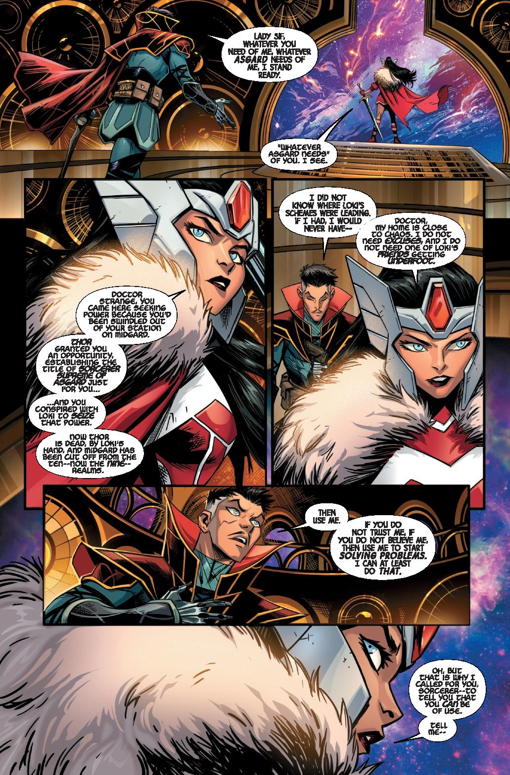 Landy has the bones of what could be a fun fantasy series, but the end result lacks emotion and that sweeping awe one would want. You get a sense that Strange knows he screwed up and is on thin ice, but there’s a lack of emotion from pretty much everyone when it comes to him. Sif should read him the riot act and verbally cut him down, but his interaction falls flat. Angela is generally a cold an unemotional character but Strange should play off of that a bit. There’s an awkwardness to so much of the comic it creates a comedic underlying feel to it all, when it’s not meant as a comedy.