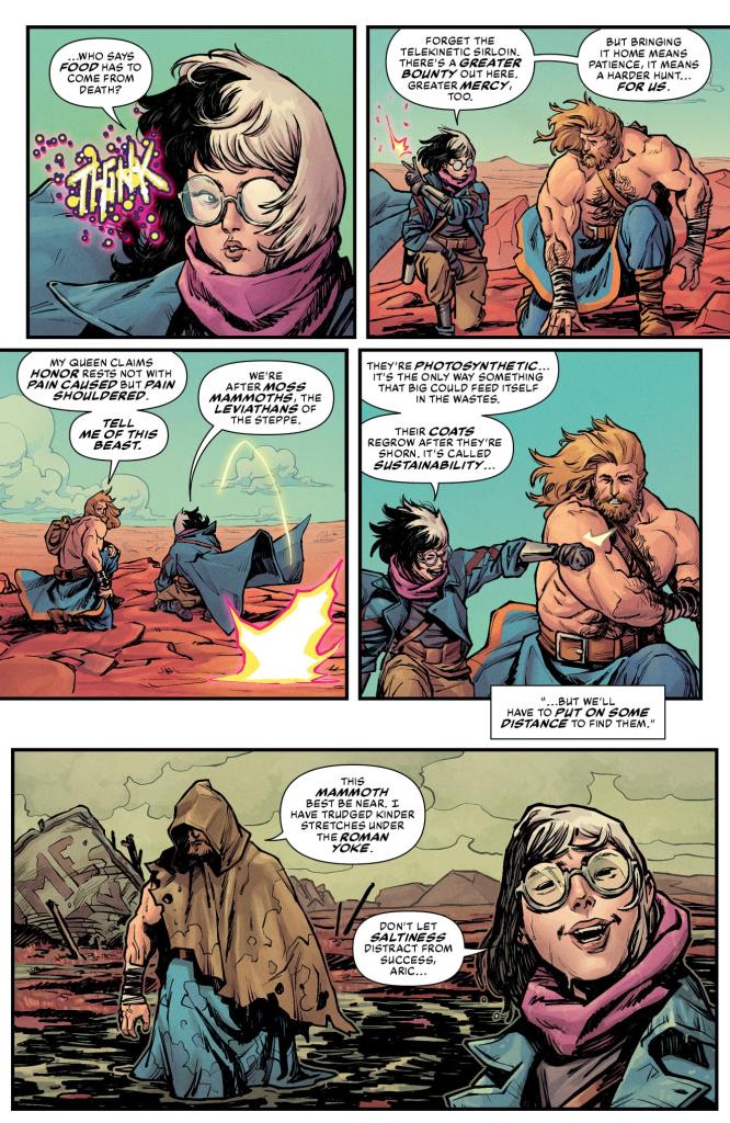 Diego Giribaldi delivers the art along with Ramon Bunge on color, J.P. Massa on backgrounds, and Martin Casanova on lettering. There’s a lot here to point to and stands out. From Mandy’s purple hair with shaved sides to clothing that emphasizes a bit hippier silhouette, there’s thought put into the characters, their surroundings, and the world. There’s also some fantastic focus on Mandy and her facial reactions which really enhance her situations and what she’s thinking.